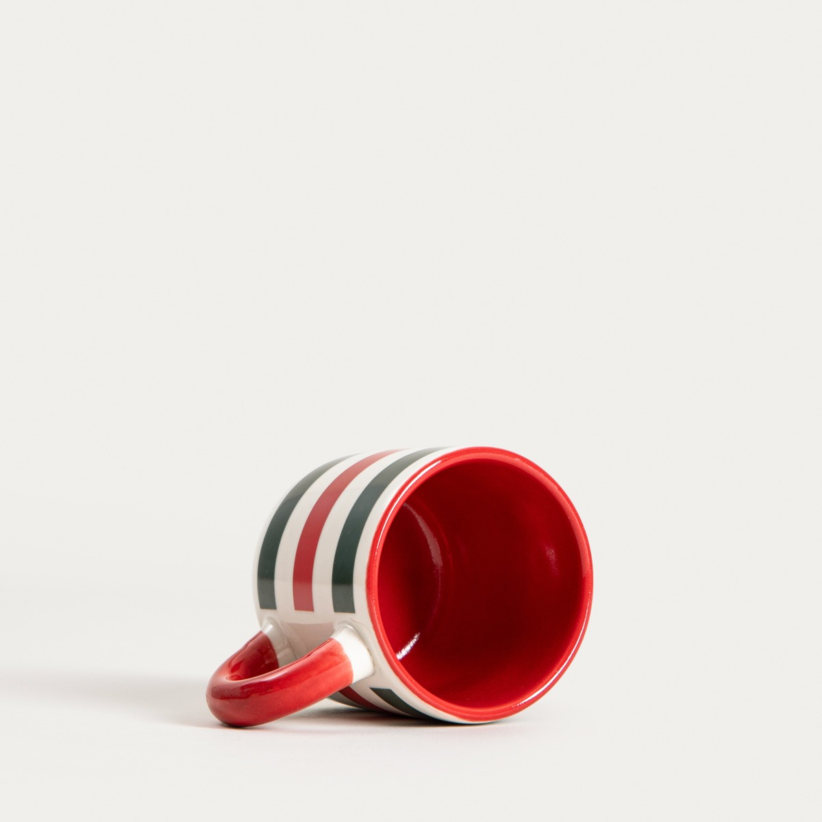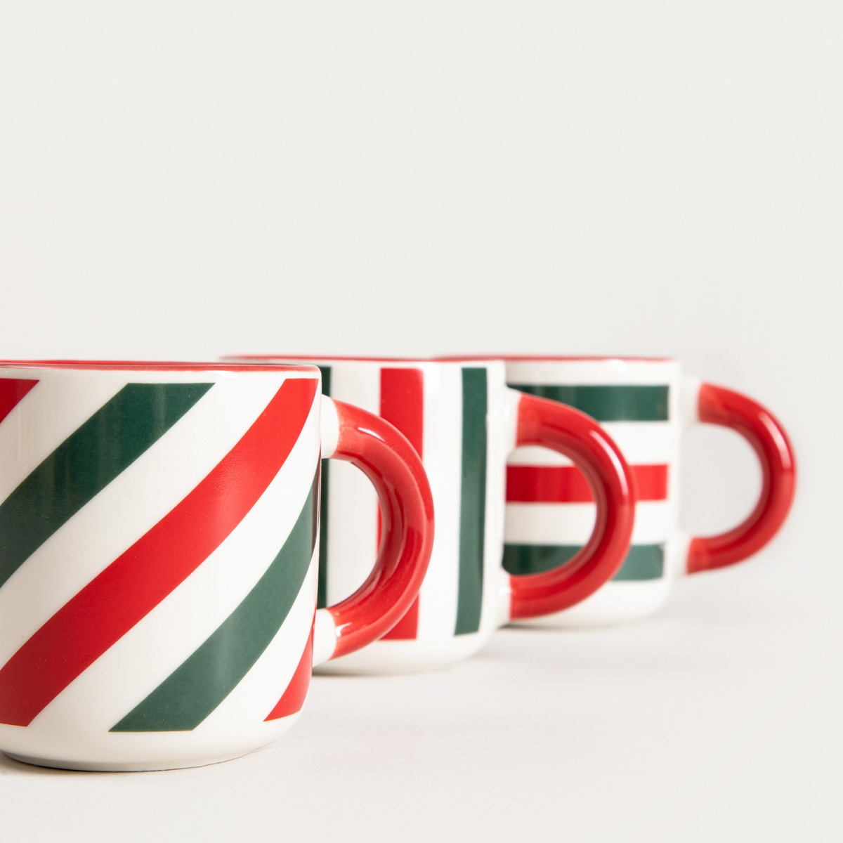 The Christmas mugs are decorated with red and green stripes. Each has a decorative red ear. The mugs in festive colors will look beautiful on the table at Christmas time.