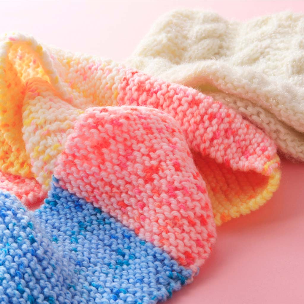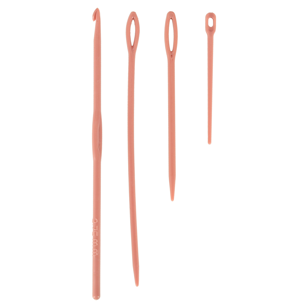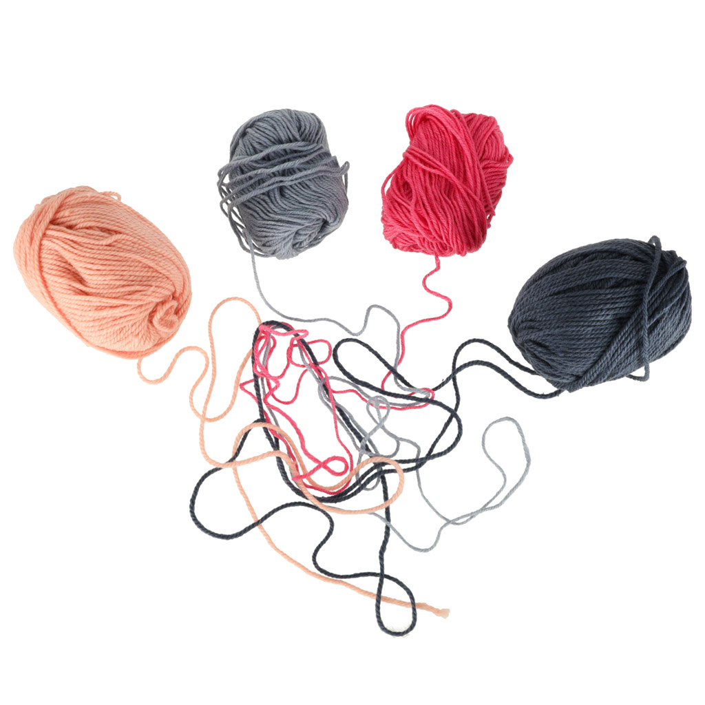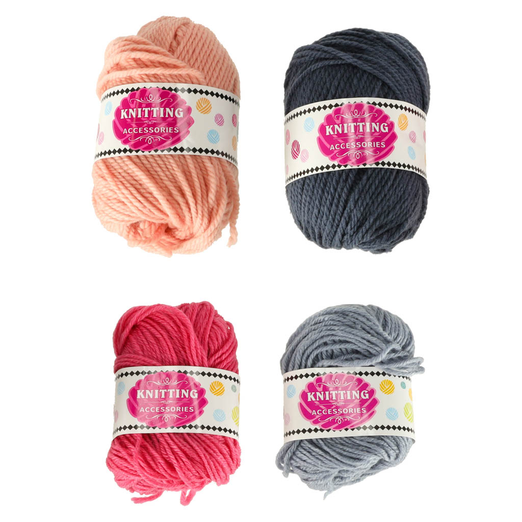 The set includes four different colored balls of yarn: dark gray, light gray, pink and beige, as well as three needles of different lengths and a crochet hook, which make it easy to finish projects and add unique details.