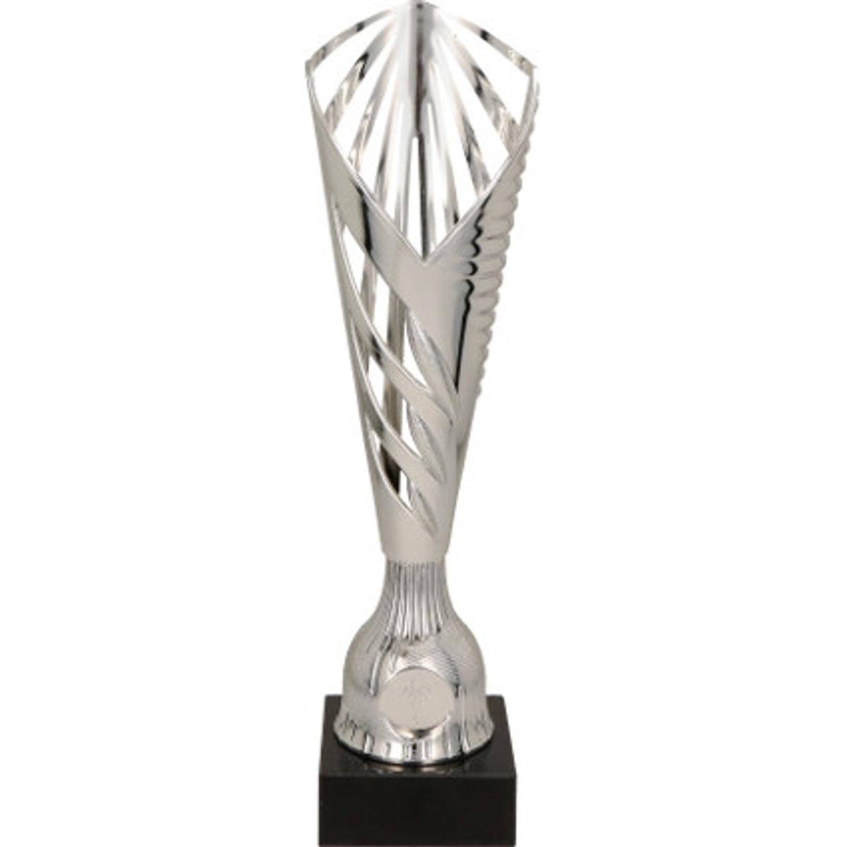 Modern sports cup tapering to the bottom, crisscrossed with holes on a marble base.
