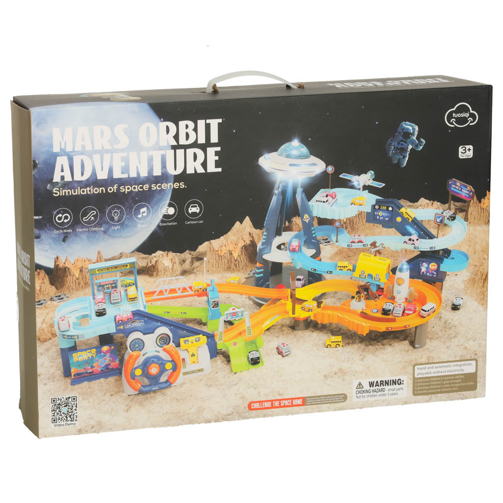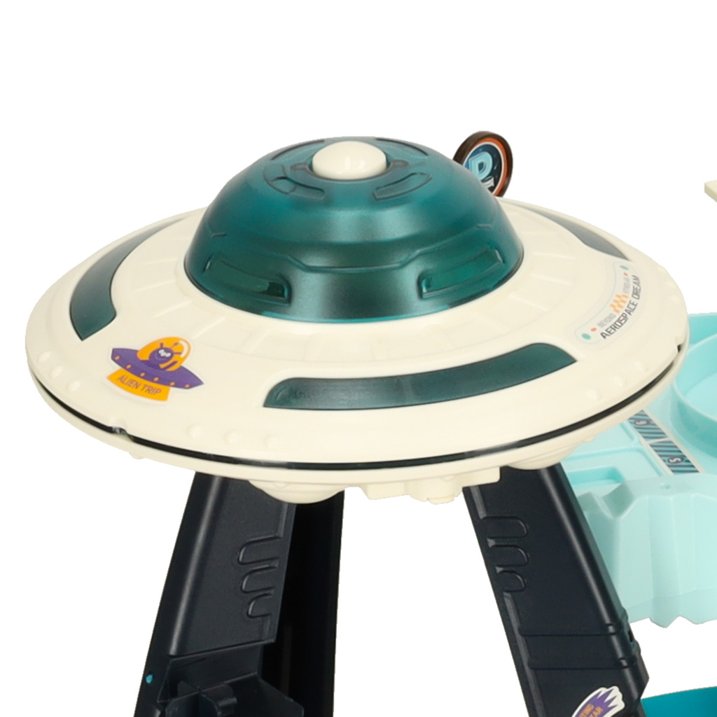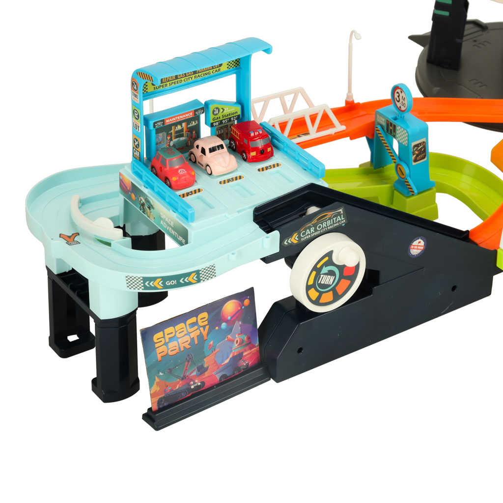 The centerpiece of the track is a futuristic UFO tower, which, when activated,lights up and makes unusual sounds adding to the atmosphere of the cosmic scenery. The car track not only entertains, but also develops the child’s manual skills, coordination and imagination, transporting them to a fascinating world full of adventures!