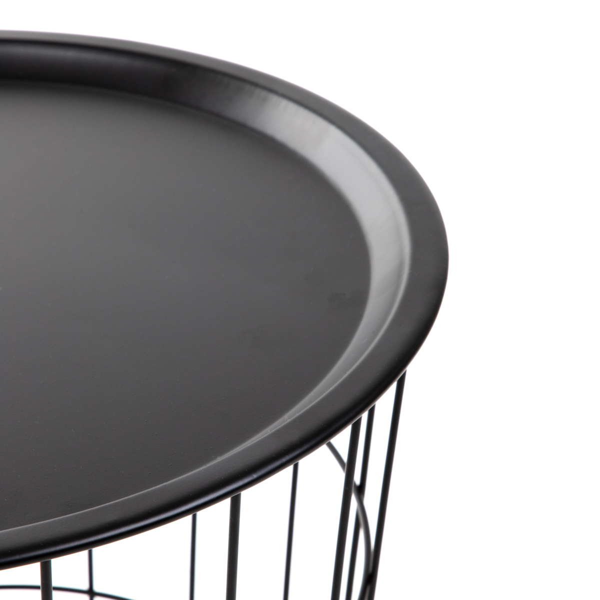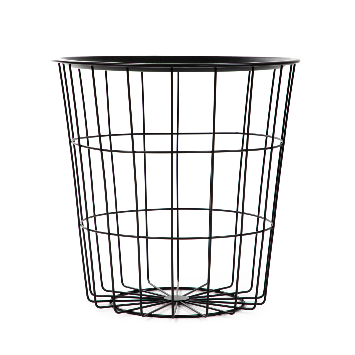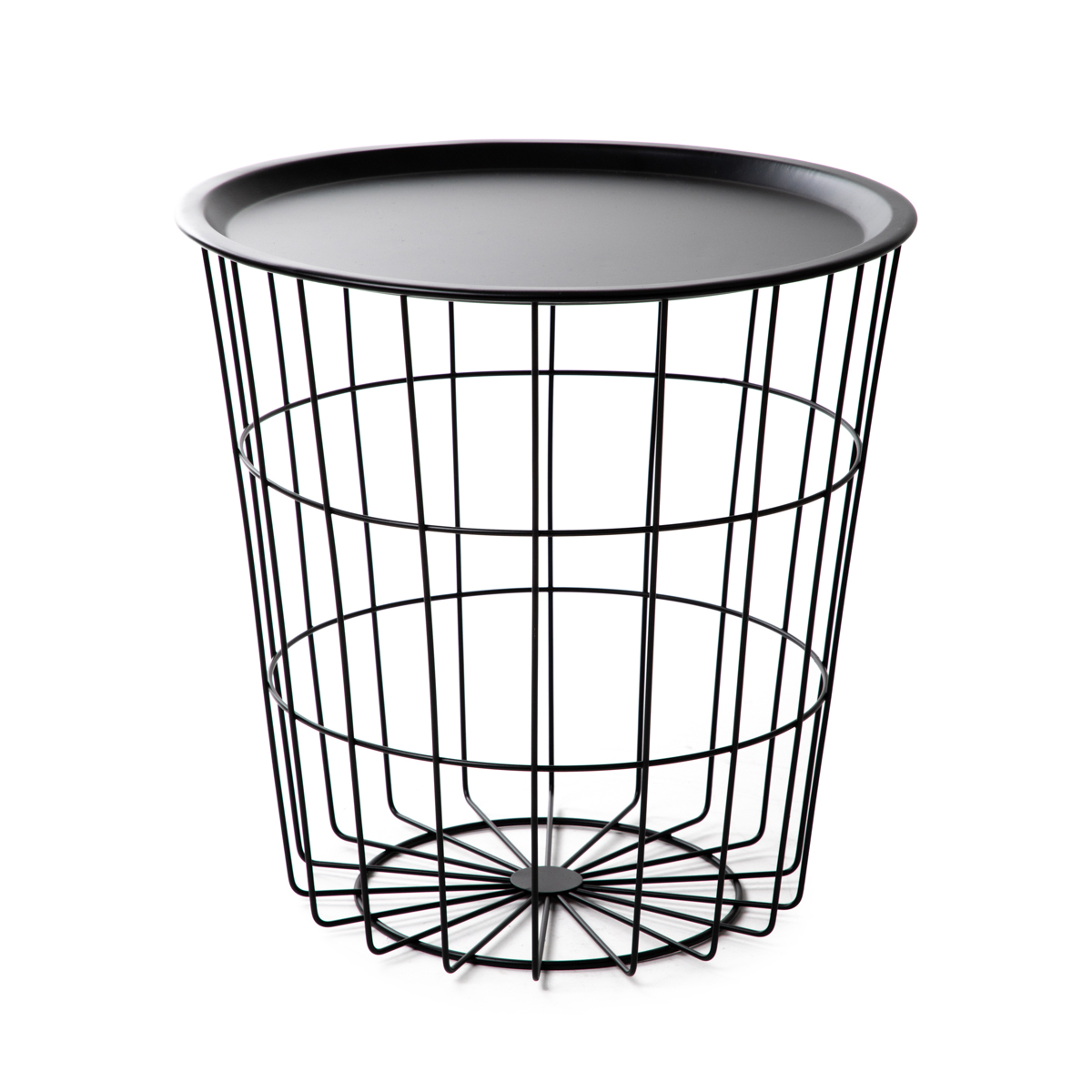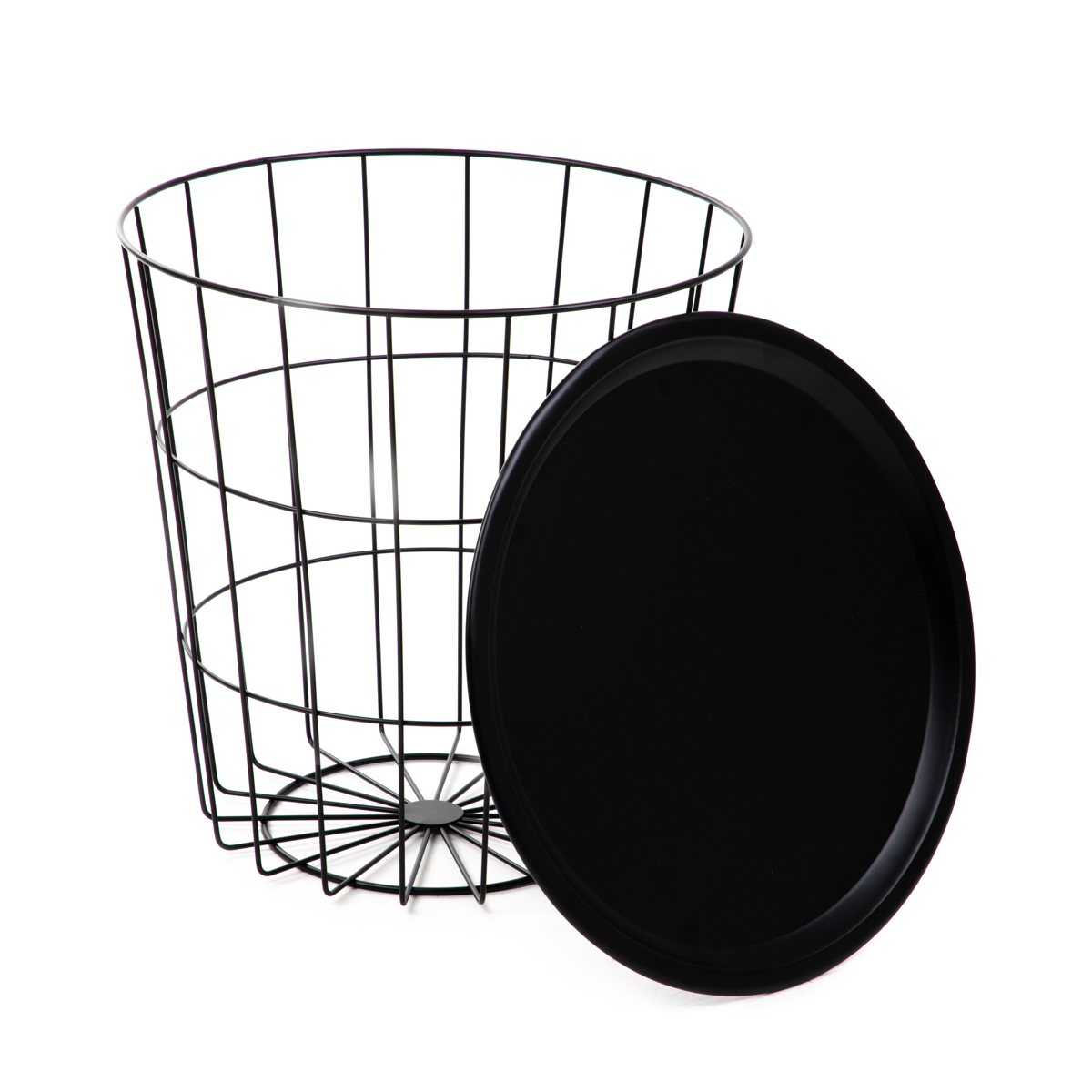 HOMLA SCANDI modern coffee table with storage space. The table takes the form of a metal basket, which is finished with a round top. Thanks to its lightweight design, you can easily move it anywhere to place a cup with a drink and a plate with snacks on it. The black color and simple form make it fit easily into most modern arrangements.