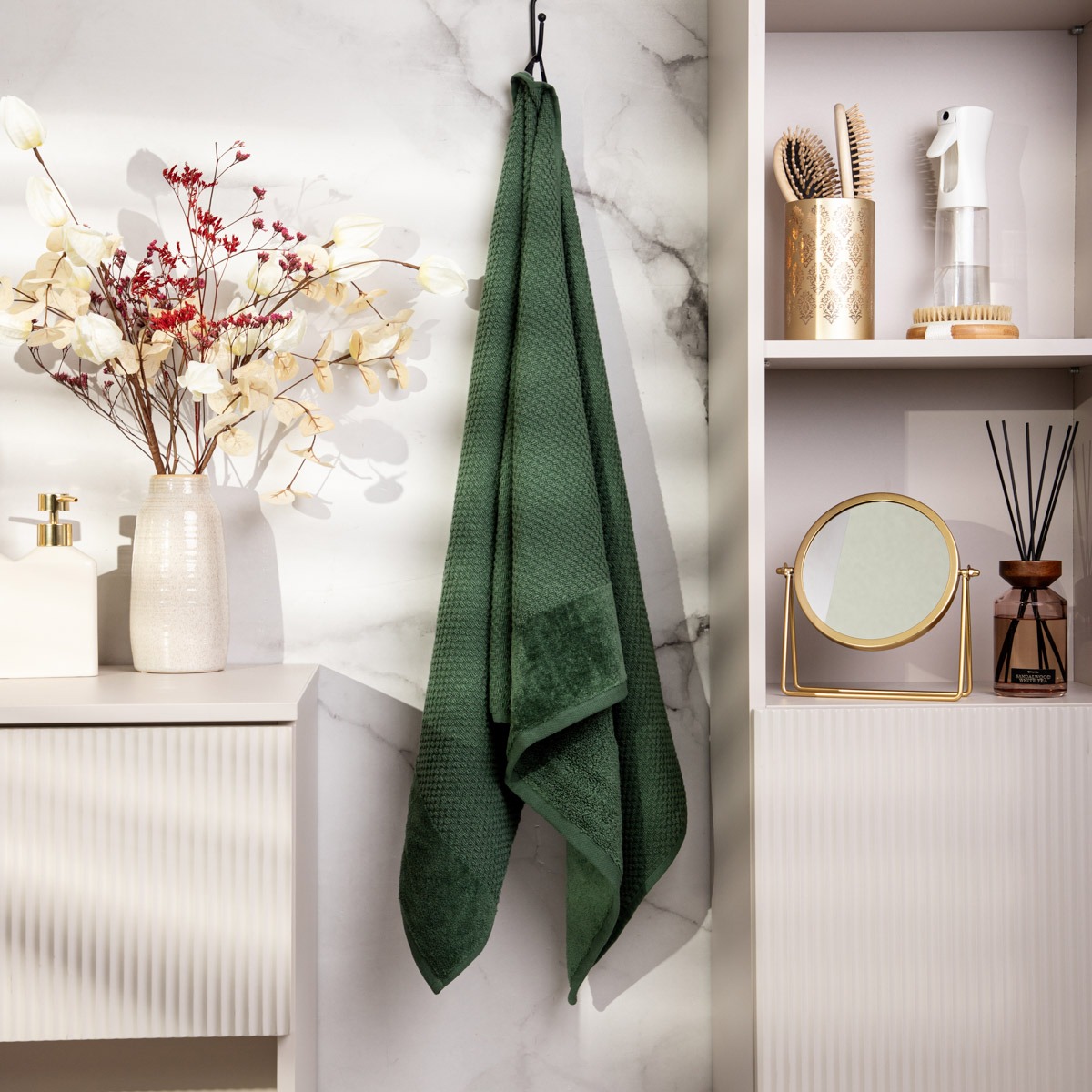 The NASIA towel in an intense green color is the perfect choice for those who want to bring a natural touch to their bathroom. Its large size of 70×130 cm makes it ideal for everyday use – perfect after a bath, as well as when relaxing on the beach or by the pool.