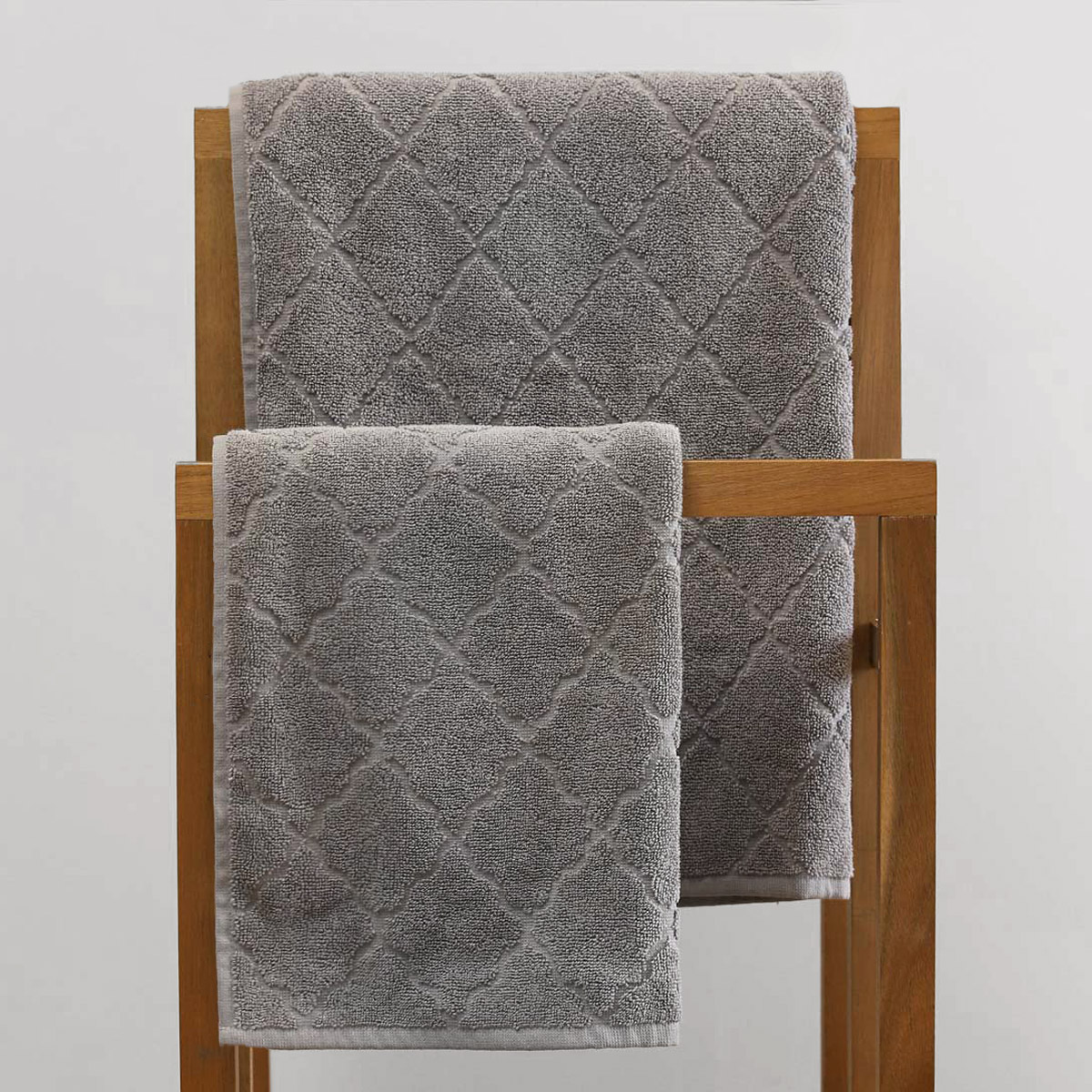 SAMINE towel is characterized by appropriate grammage, so it is extremely absorbent, and at the same time soft and pleasant to the touch. On its surface you can notice decorative indentations in the form of a Moroccan clover. A pleasant color scheme of light gray will become a suitable base for other bathroom decorations.