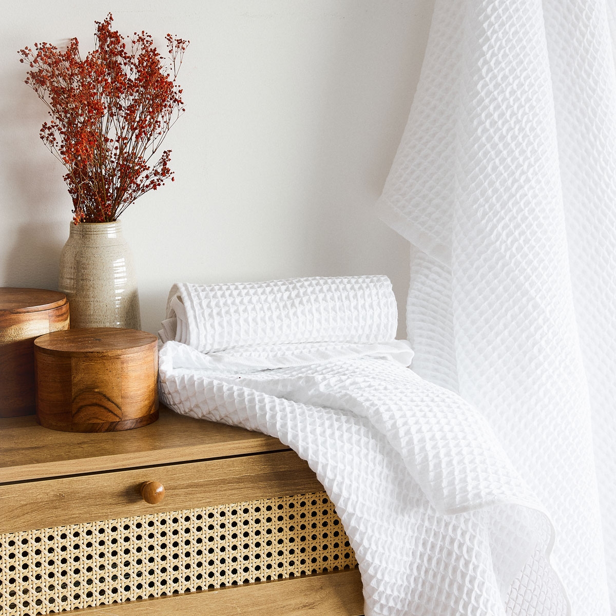 The VAFFEL towel is ideal for drying your body after a bath. It is large enough to wrap around you comfortably and wipe your entire body thoroughly. The perfectly absorbent cotton will easily deal with any water droplets and traces of moisture, leaving your skin smooth and refreshed. We’ve sewn a handle into one edge so you can easily hang the towel on a hook so it’s always close at hand.