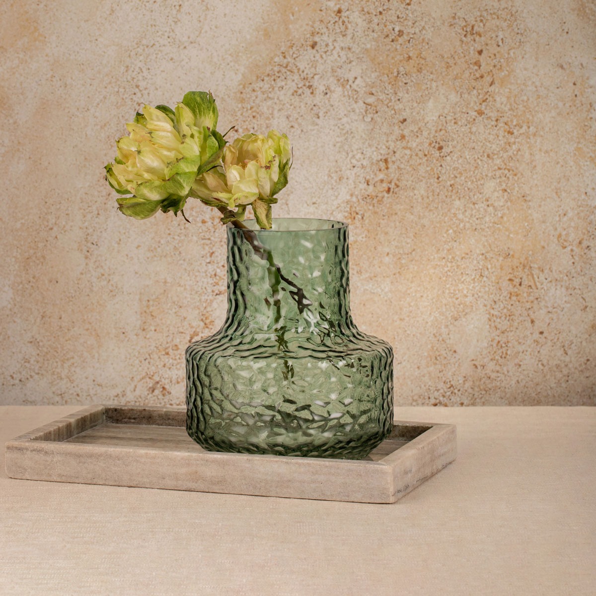 The LOMEN vase is a striking interior accessory. Made of dark green glass with a hammered surface, it impresses with its striking structure and deep color. The geometric shape combined with the unique finish makes it perfect for both modern and eclectic arrangements.