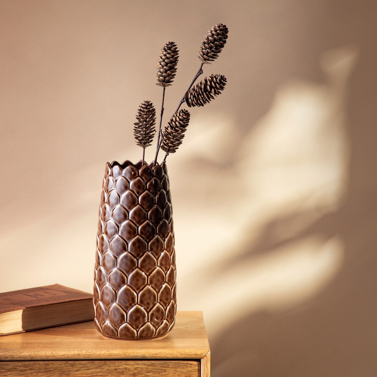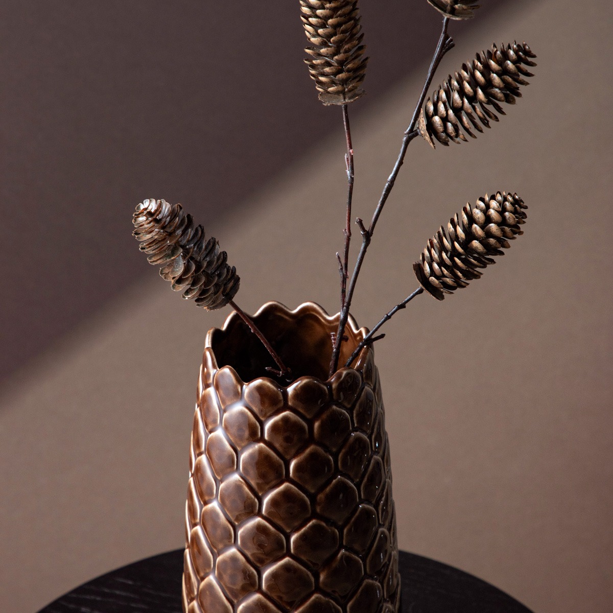 The PINECONE vase is a unique decoration in the shape of a pinecone, which fits perfectly into the atmosphere of autumn arrangements. Its rich texture and glossy ceramic in a warm brown shade make it a stylish accent to any interior – from rustic to modern.