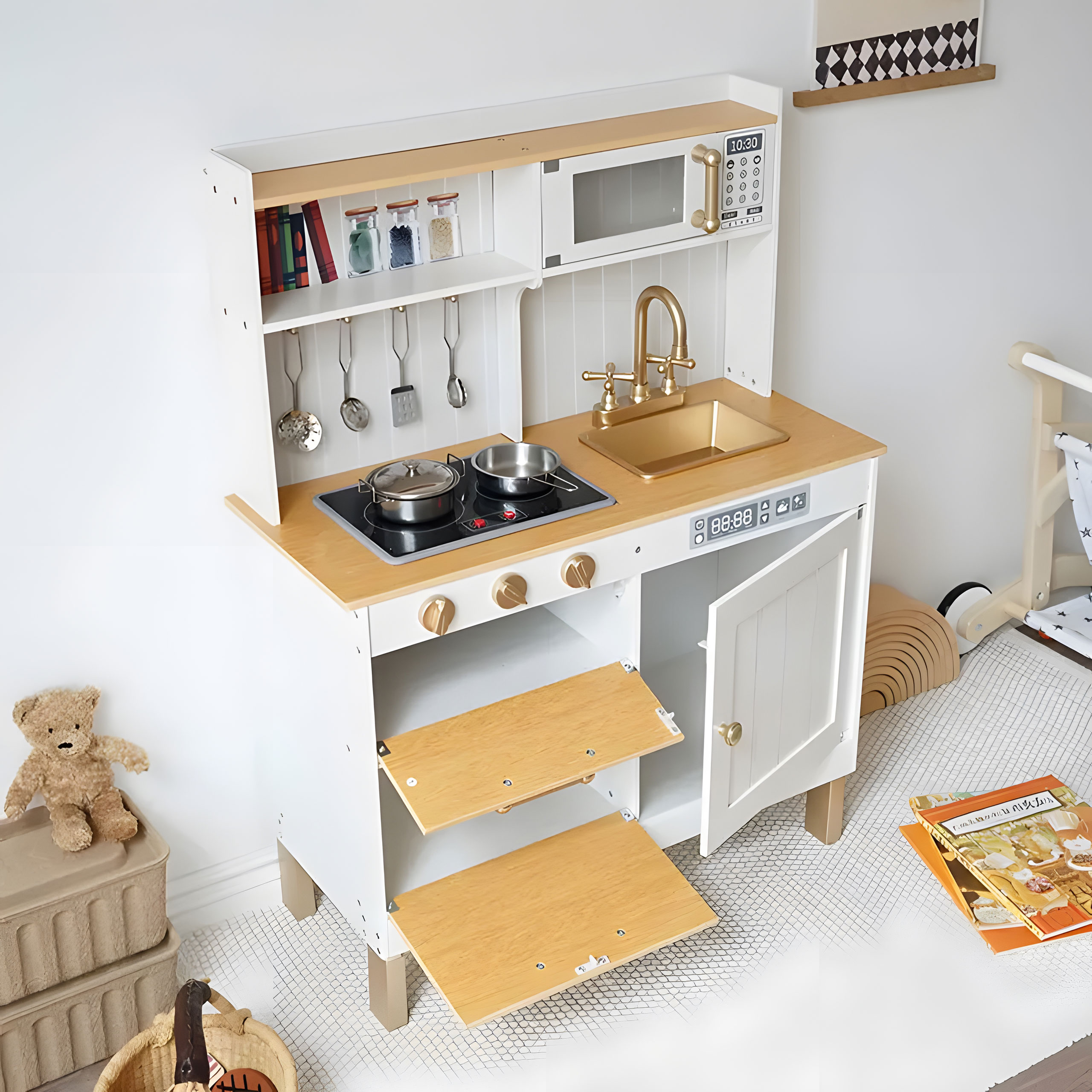 - The rotary knobs placed under the countertop make a “clicking” sound when turned. The kitchen has opening doors, thanks to which the fun will be even more engaging.