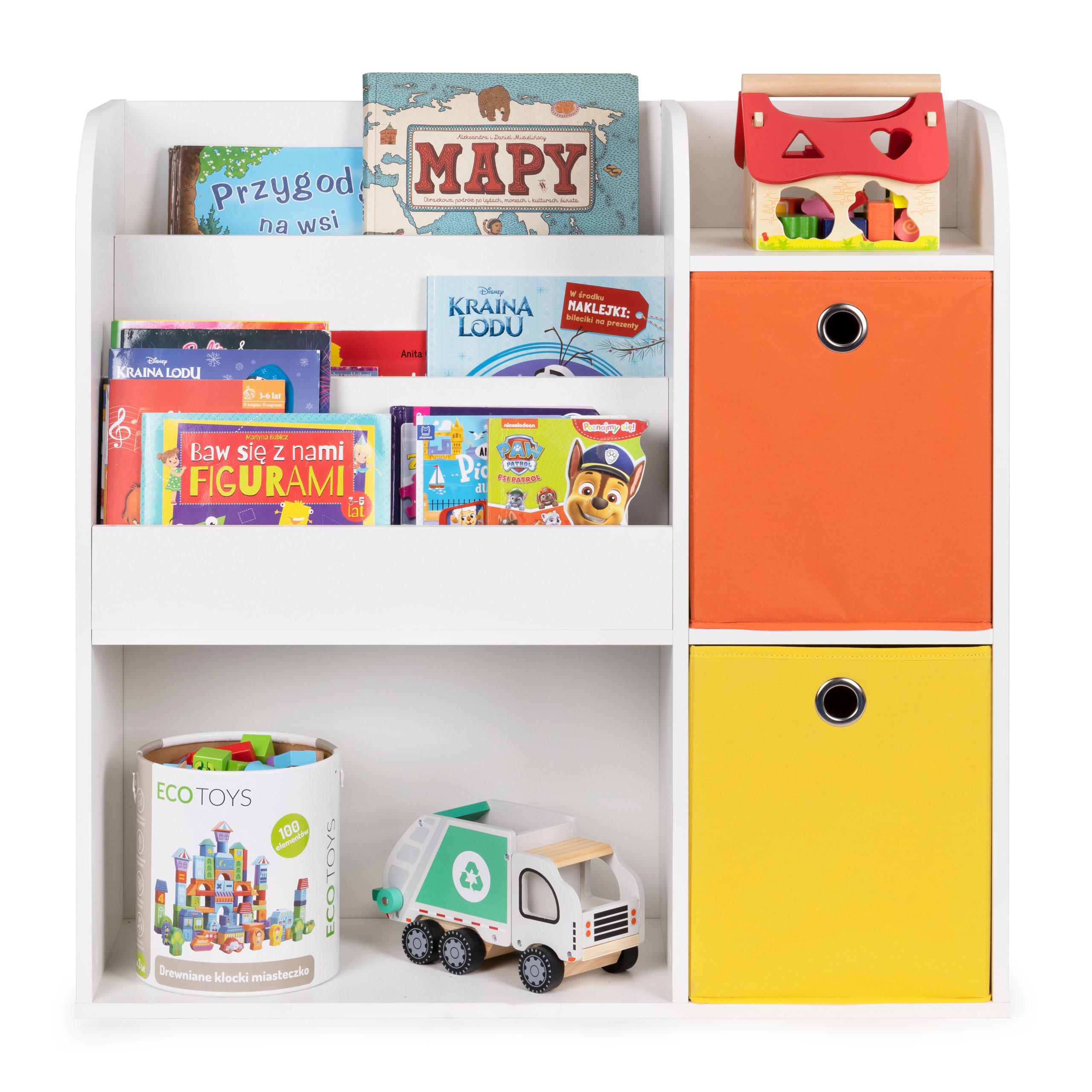 The furniture is made of durable chipboard and finished with a damage-resistant laminate. Deep compartments will store favourite books, albums, colouring books and magazines, while the shelves are perfect for displaying toys. Additionally, the set includes 2 spacious fabric bins, ideal for blocks and other accessories.