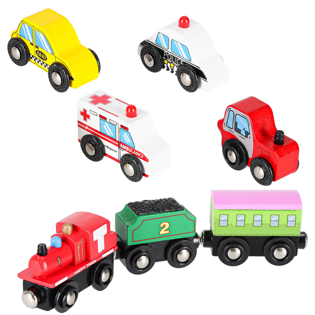 8 vehicles, including, among others, a locomotive with two cars, an ambulance, a police car