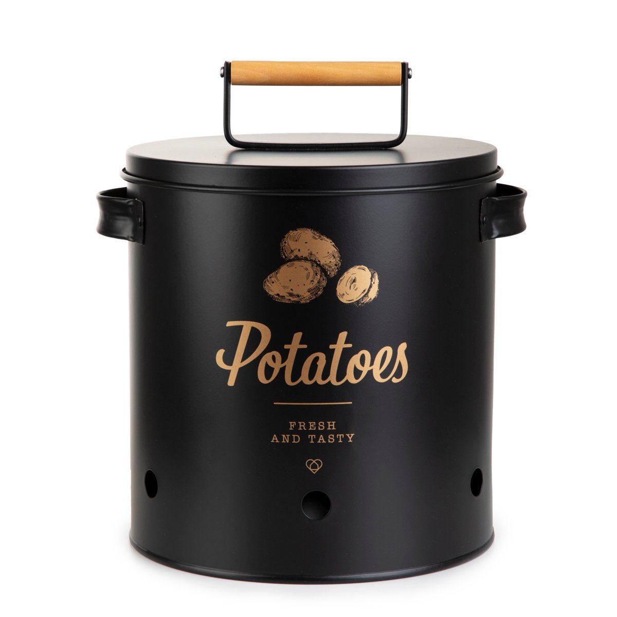 Place your potatoes in the HOMLA YENNIS metal container to enjoy their freshness and unique taste for longer. We have made holes in the container to allow air to flow freely. We have also equipped it with handy handles that make it easy to carry, and a lid that shields the contents, protecting the potatoes from contact with light. Thanks to its carefully crafted aesthetics, the container is not only a practical accessory, but is also a stylish decorative addition.