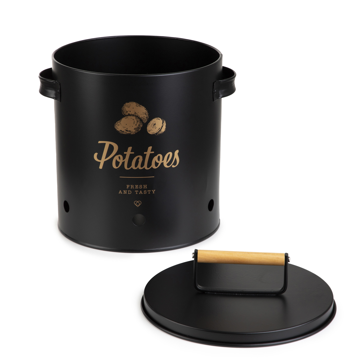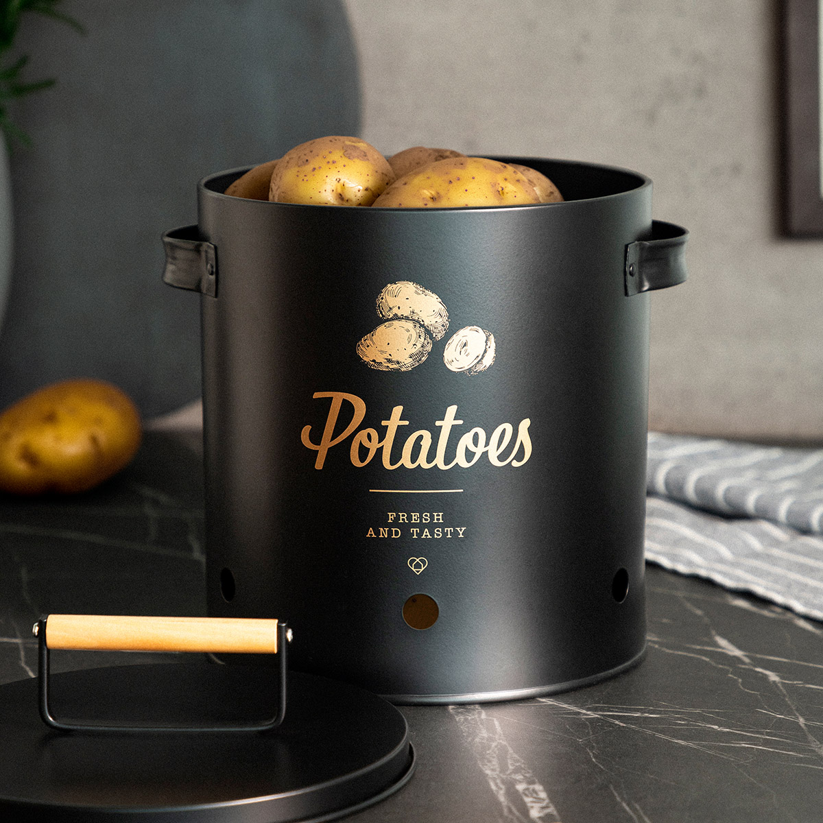 The YENNIS container is designed for storing potatoes, but you can also place other vegetables that require a dark and cool place. The container is black in color, decorated with gold graphics and an inscription that indicates its contents. It is ideal for placing in the kitchen, cellar or pantry.