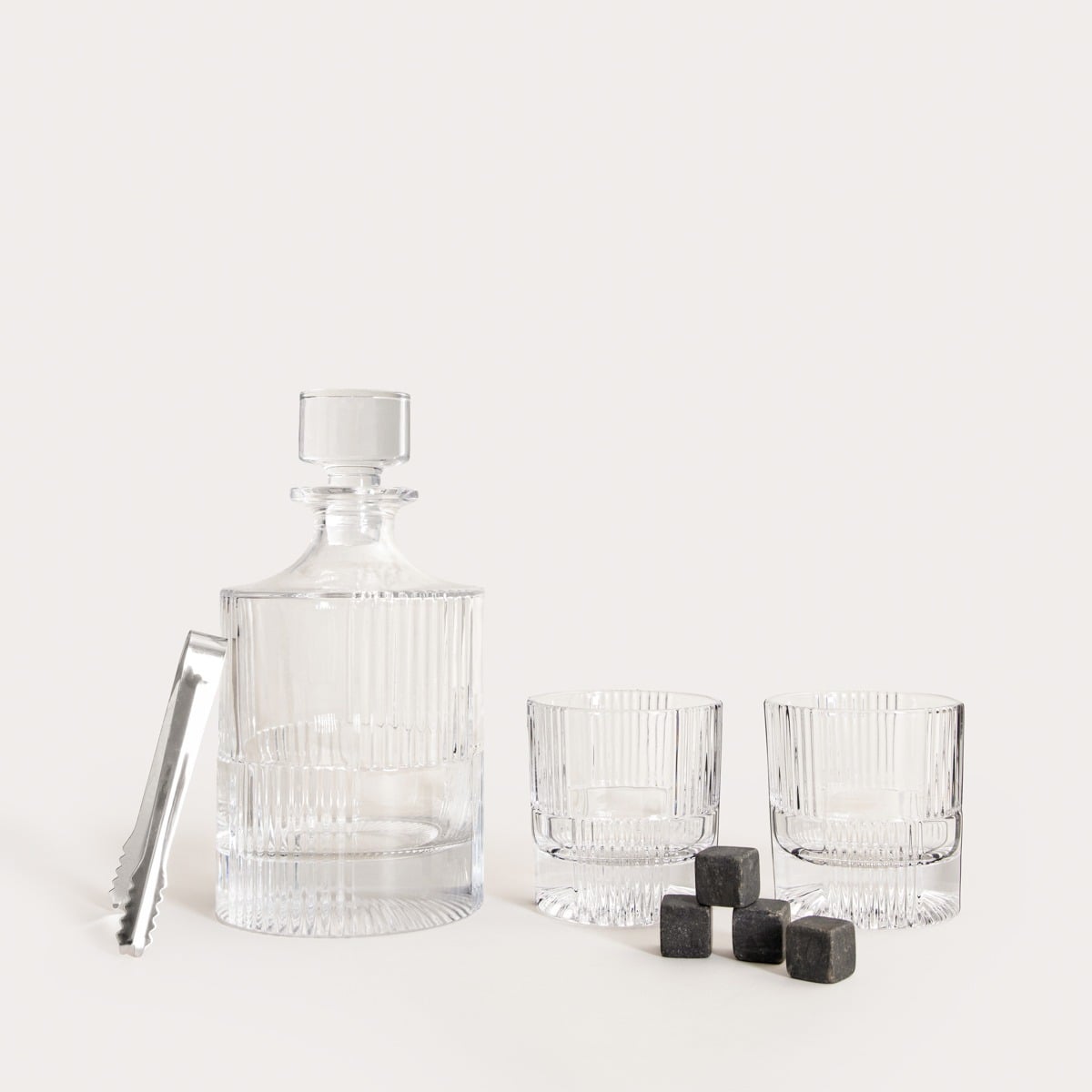 The ELEGANZA set is a stylish whiskey serving set that brings elegance and classiness to your interior. The set includes a decanter, two glasses, ice tongs and four cooling stones. Made of high-quality glass and stainless steel, it impresses with its precise finish and versatile design. Ideal for serving your favorite beverages at home or at gatherings with friends.