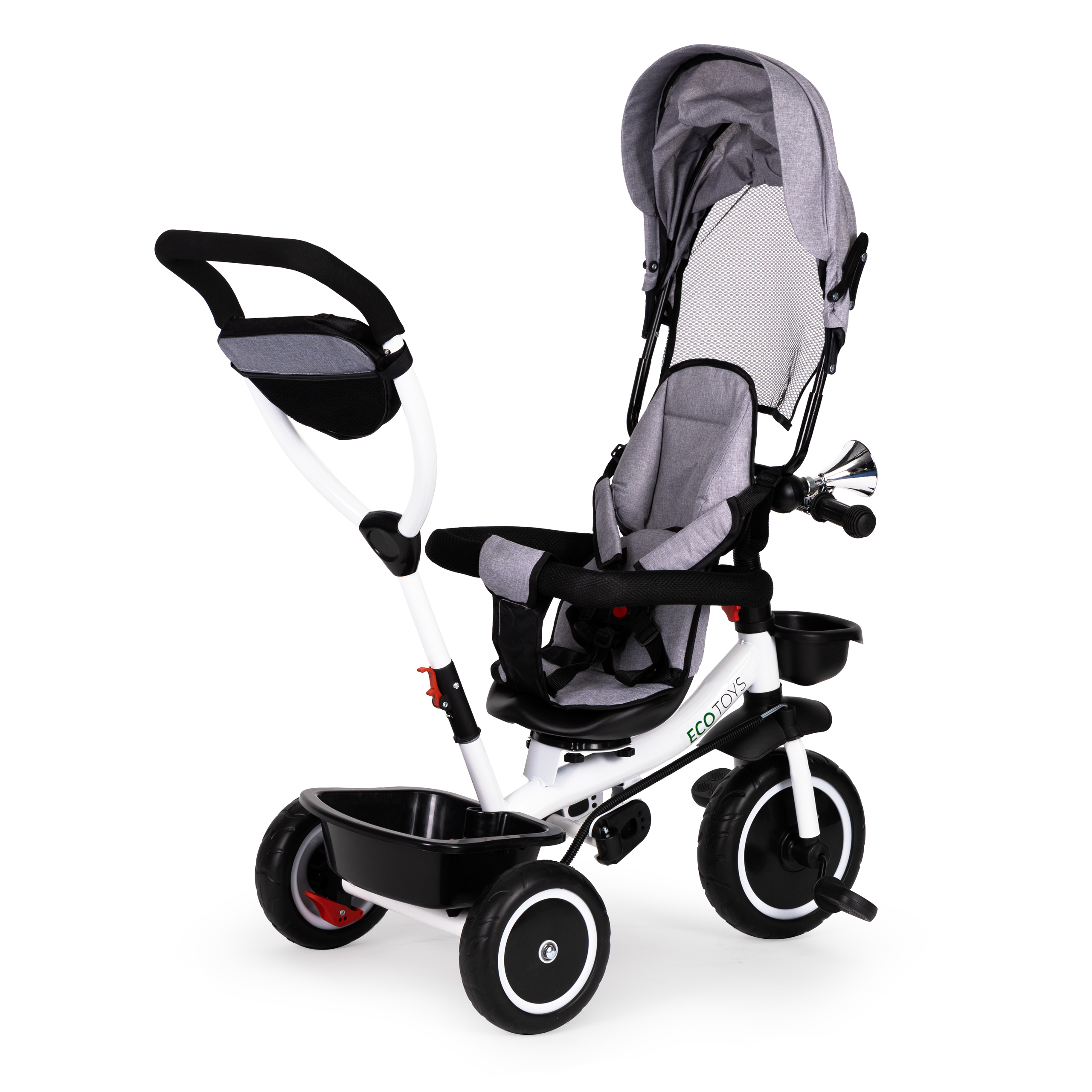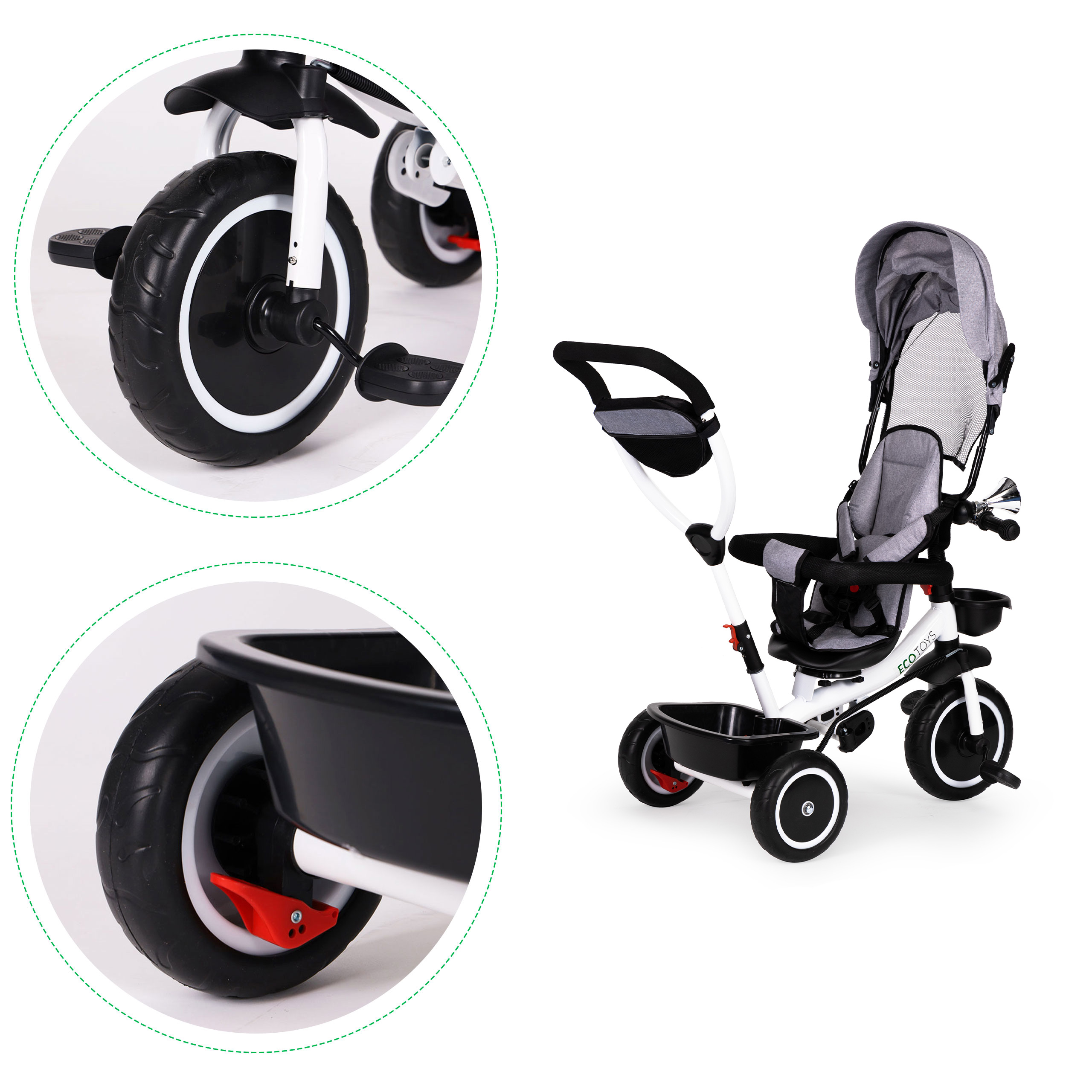 ECOTOYS trīsritenis apvieno vairākas praktiskas funkcijas, lai nodrošinātu drošu un ērtu rotaļu laiku jūsu bērnam. Tas ietver mīkstu, ērtu atzveltni ērtai sēdēšanai, savukārt drošības jostas un stieņi pasargā bērnu no izkrišanas. Salokāms jumtiņš nodrošina aizsardzību pret sauli un lietu, bet īpaši veidots rāmis ar grozāmu sēdekli atvieglo mazuļu iekāpšanu.