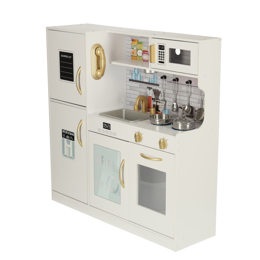 Šī koka mini virtuve ir veidota tā, lai atgādinātu īstu virtuvi, taču mini versijā. Tajā ir ledusskapis ar kubiņu apdruku, plīts ar cepeškrāsni,mikroviļņu krāsns, trauku mazgājamā mašīna un rotaļu telefons, plaukts, skapis un gatavošanas piederumi. Pateicoties kustīgām pogām un atveramām durvīm, spēle ar koka virtuvi kļūst ļoti reālistiska, sniedzot bērnam sajūtu, ka viņš gatavo kā īsts pavārs. Tā irrūpīgi izstrādāta virtuve, kas aprīkota ar visām būtiskākajām ierīcēm, kādas var atrast labākajās bērnu koka virtuvēs, sākot ar cepeškrāsni un beidzot ar ledusskapi, lai katrskulinārijas piedzīvojums būtu aizraujošs.
