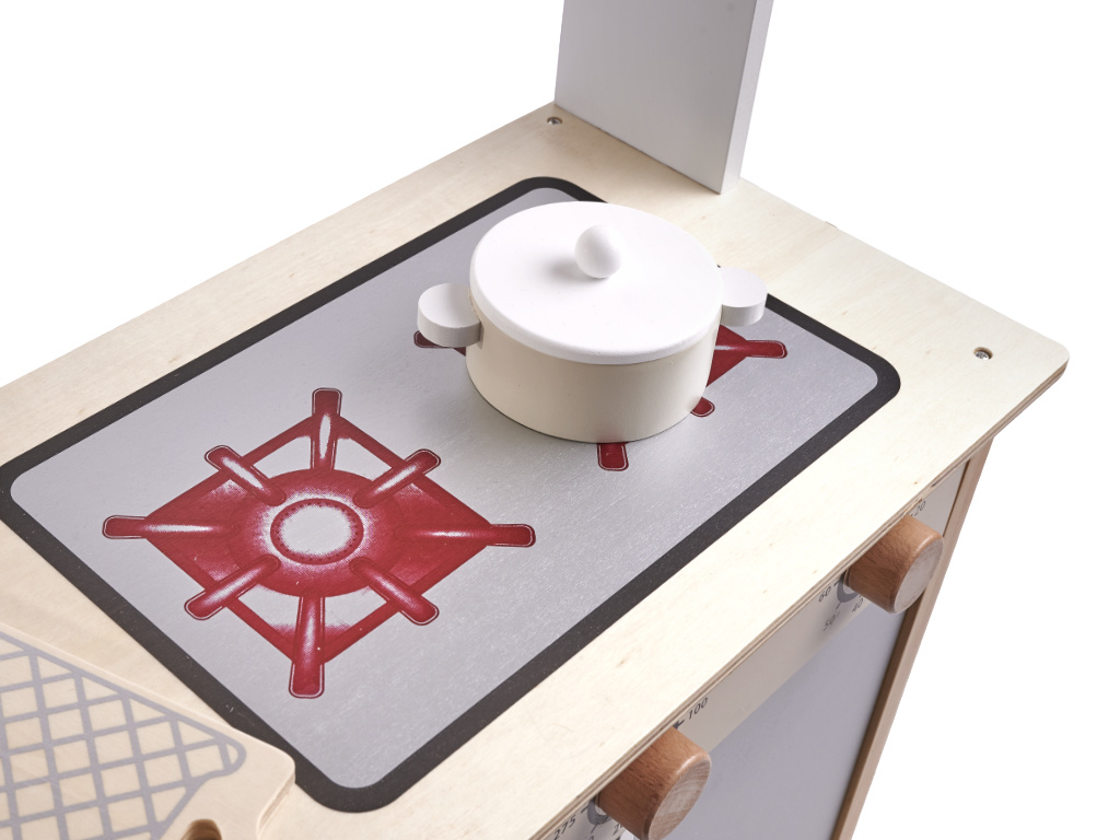 Plīts vadības pogas ir ļoti reālistiskas, līdzīgas tām, kas atrodas uz īstas ierīces. To pagriešana neprasa lielu spēku, tas atvieglos jūsu mazuļa darbu!