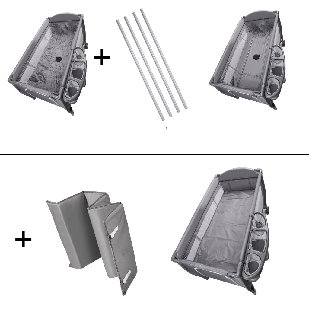 Cita starpā gultiņai ir pievienojams otrais guļamstāvs un pārtinamais galdiņš ar kabatām. Šādas ērtības papildina tās funkcionalitāti, padarot to piemērotu īsākiem un garākiem ceļojumiem. X formas dizains, neslīdošas kājas un bloķējami riteņi padara gultiņu praktisku un stabilu. Gudri izvietotās kabatas un nodalījumi atvieglo izkraušanu un bagāžas sakārtošanu. Gulta ar pārtinamo galdiņu nodrošina komfortu, pārtinot un pārģērbjot mazuli.