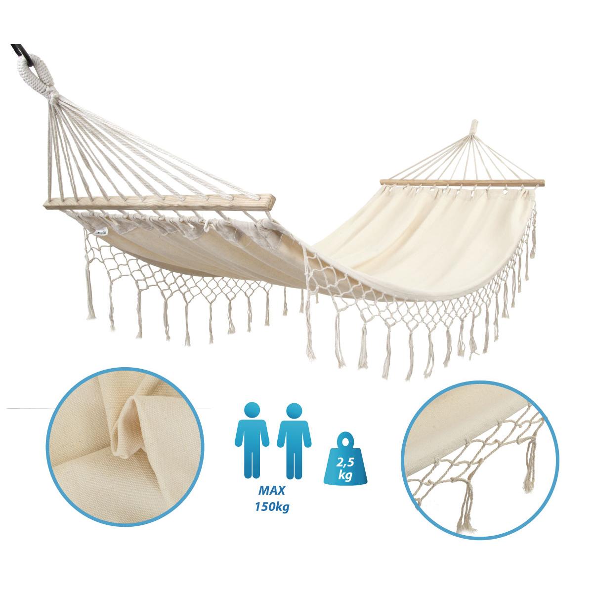 Augstas kvalitātes materiāls un izturīga konstrukcija ar kravnesību līdz 150 kg! nodrošinās jūsu drošību un īpašu komfortu. Tas ir ļoti viegls, tāpēc to var ņemt līdzi praktiski jebkur. Izgatavots no dabīgas kokvilnas, tas ir ļoti izturīgs un elpojošs, tāpēc jūs varēsiet baudīt saldu atpūtu gadiem ilgi.