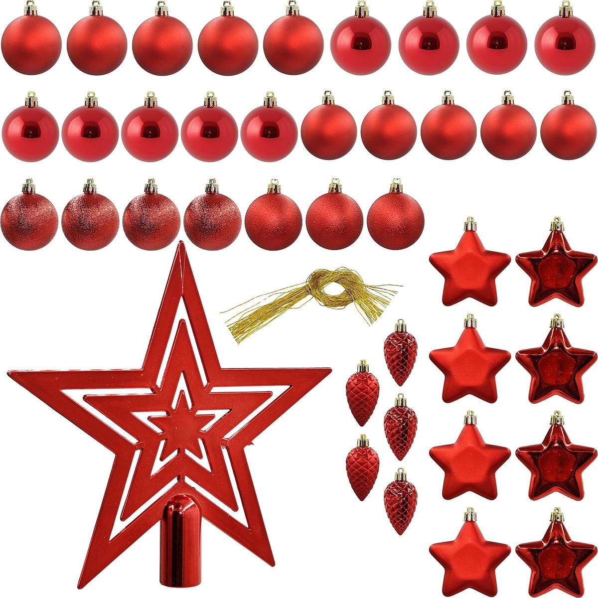 • Komplektā ietilpst: – Zvaigznes uzgalis – 1 gab., bumbulis/karokāts – 5 gab. 7,5 cm, 6 cm diametra bumbulis – 17 gab., 8 cm diametra bumbulis – 8 gab., 7 cm diametra bumbulis – 9 gab., 8 cm diametra zvaigznes bumbulis – 8 gab.