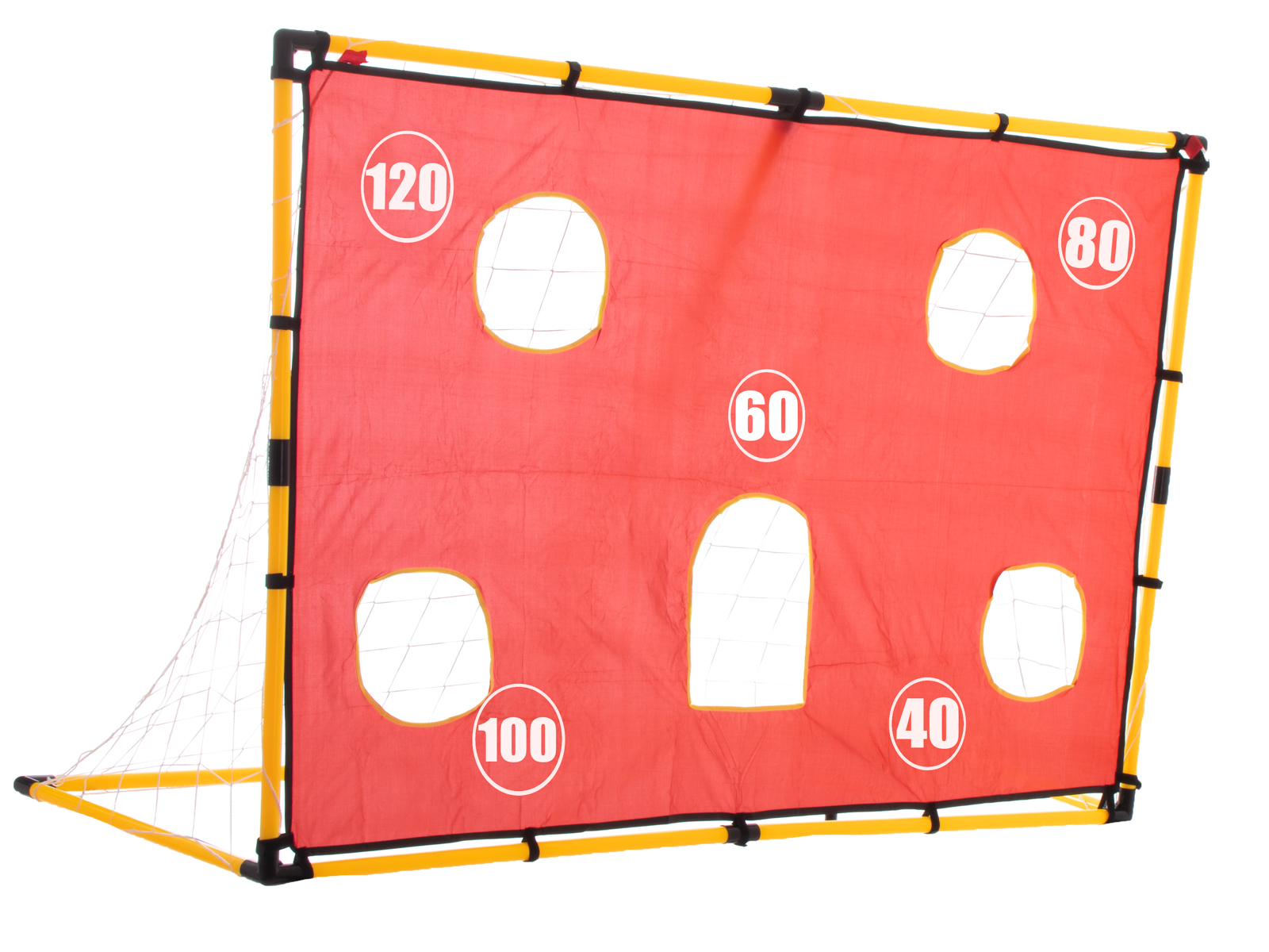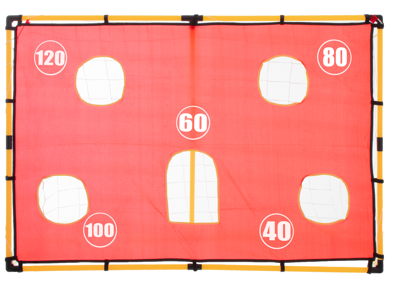 Lielie vārti ar paklājiņu, kurā ir izgriezti caurumi, ļaus jums trenēties precīzos sitienos pa vārtiem, neiesaistot vārtsargu.