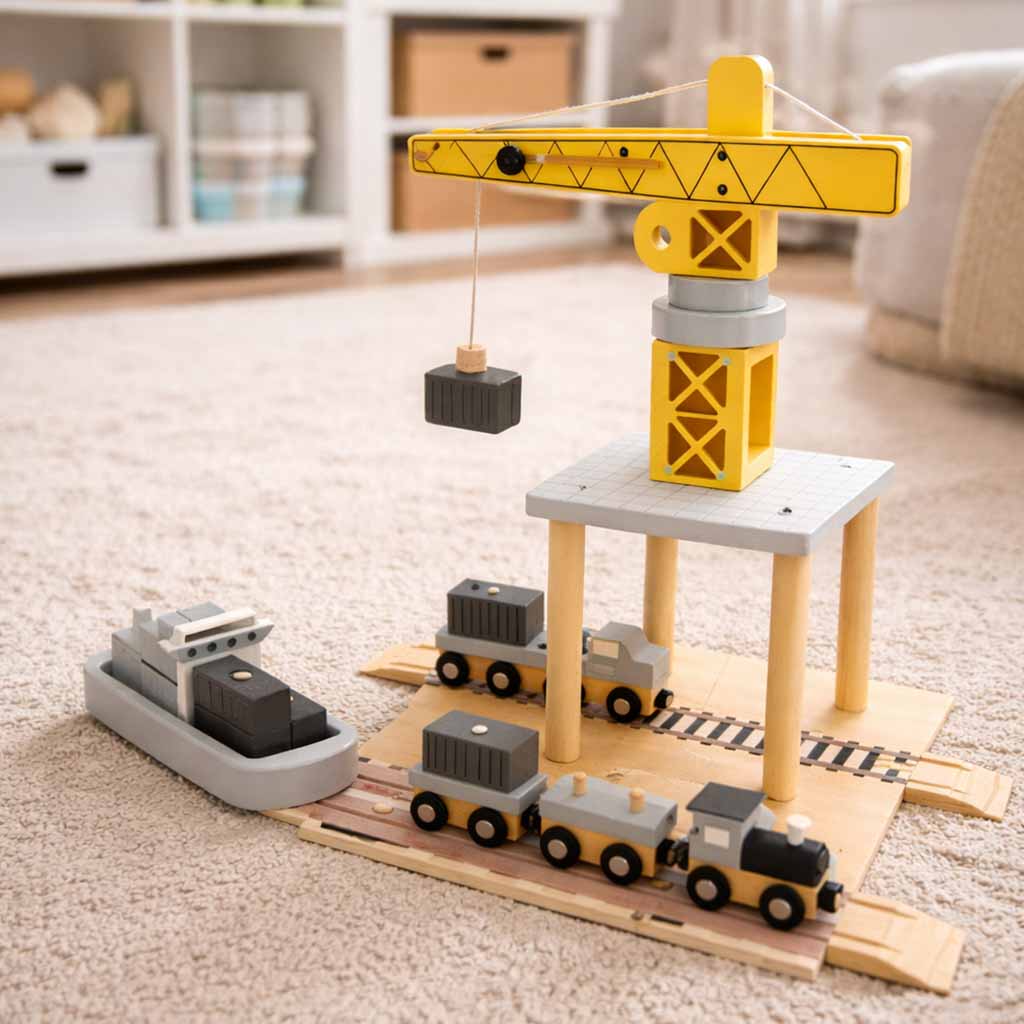 Koka jūras osta ar celtni ir lieliska rotaļlieta mazajiem transporta un būvniecības entuziastiem. Komplektā ietilpst dzeltens ostas celtnis, kuru var pagriezt un pacelt konteinerus no kuģa, lai transportētu transportlīdzekļus – kravas automašīnu un vilcienu ar diviem vagoniem. Dažādie elementi ļauj bērnam izspēlēt ainas gluži kā īstā ostā, attīstot viņa radošumu, manuālās prasmes un kustību koordināciju.