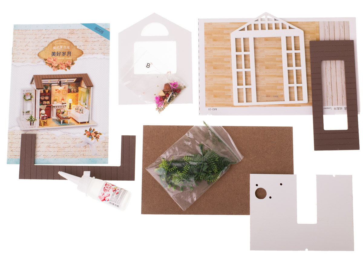 Koka leļļu mājas dzīvojamās istabas modelis montāžai LED 8008-A 20,6cm