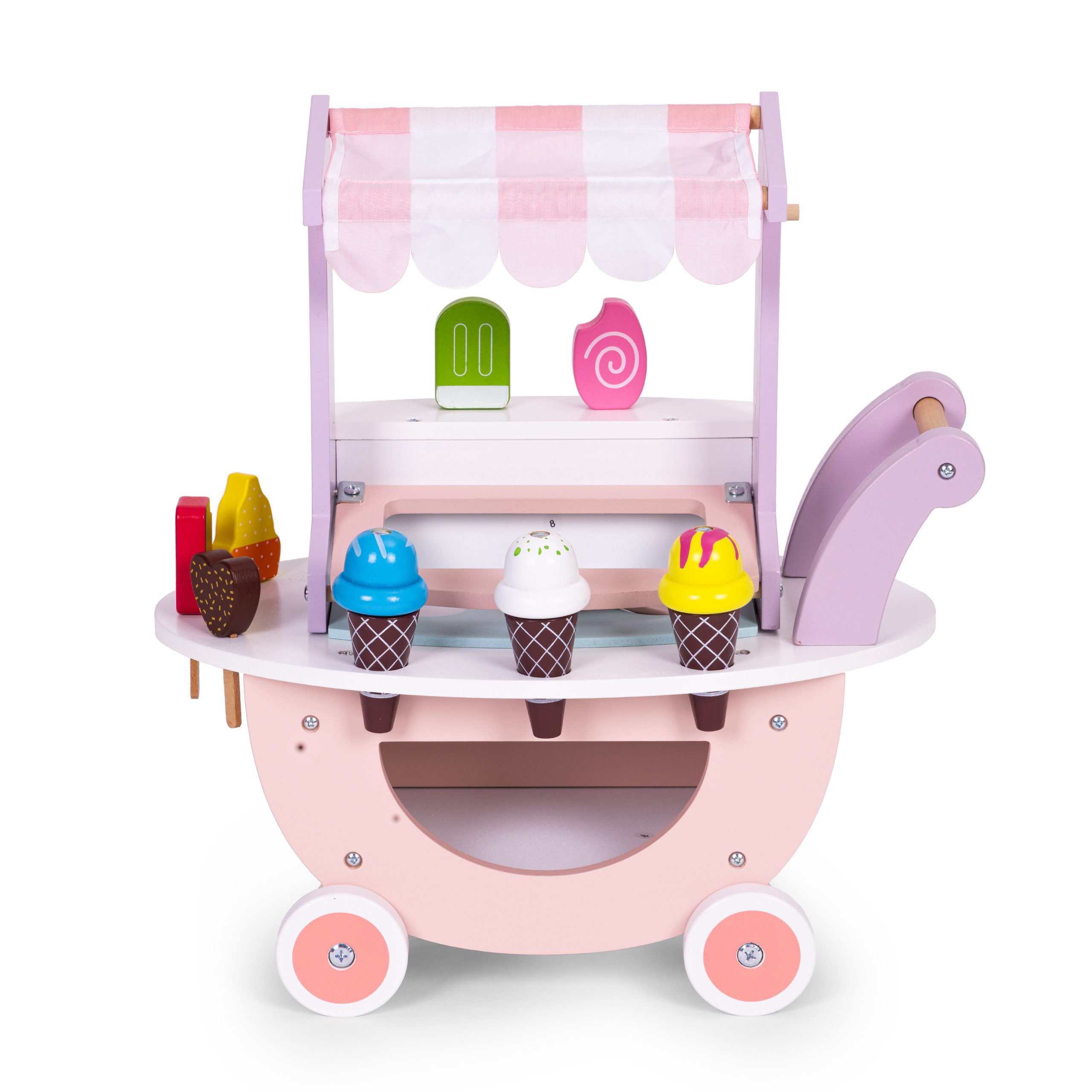 Bērniem patīk vērot un atdarināt pieaugušos, un ikdienas darbības bieži vien tiek izspēlētas viņu spēlēs. Pateicoties ratiņiem, viņi var iejusties gardā, krāsainā saldējuma pārdevēja lomā. Papildus jautrai izklaidei bērns attīstīs iztēli, radošumu un manuālās prasmes, un ratiņi ātri kļūs par iecienītāko rotaļlietu.