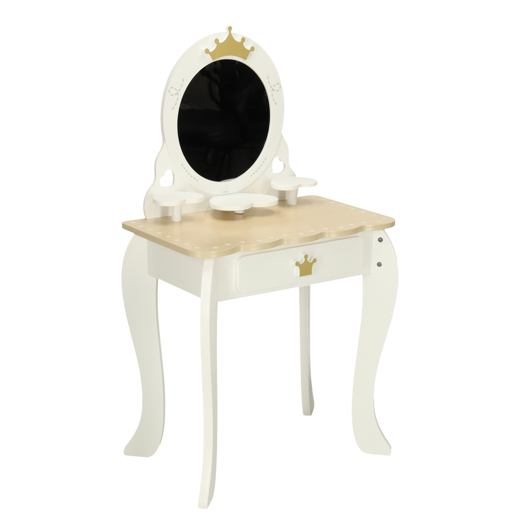 Tualetes galdiņš un tā piederumi ir pilnībā izgatavoti no koka, kas ir slīpēts līdz gludumam un krāsots ar netoksiskām krāsām. Baltā un zelta krāsu gamma padara komplektu minimālistisku un lieliski noderēs kā bērna istabas rotājums.