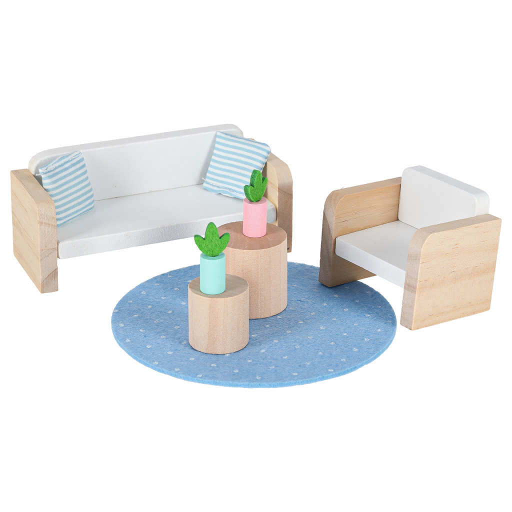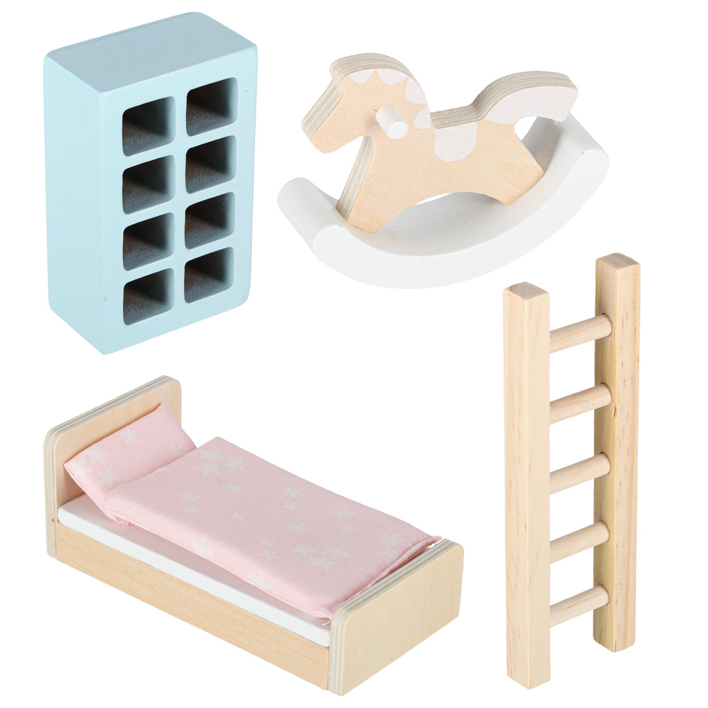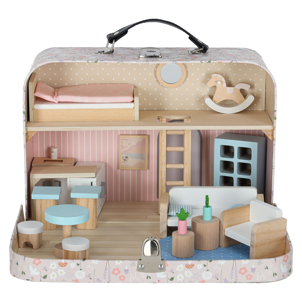 Miniatūrajā leļļu namiņā čemodāna formā ir burvīgas mēbeles no auduma un koka. Maigas pasteļkrāsas kombinācijā ar dabīgo koku piešķir interjeram mājīgu atmosfēru. Leļļu namiņā var novietot mazas lelles un figūriņas – iejūtoties rotaļlietu piedzīvojumos, var attīstīt empātiju un emocionālo inteliģenci.