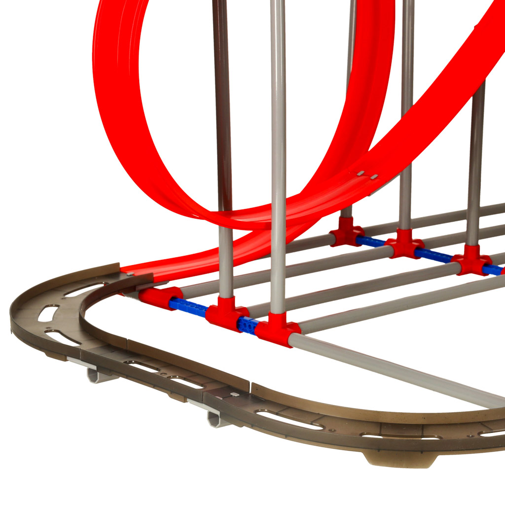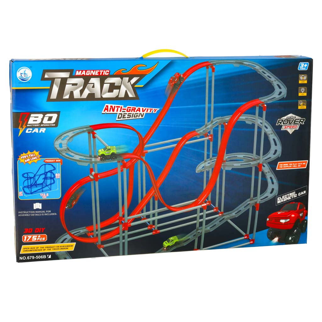 Komplektā ir 175 detaļas, lai izveidotu iespaidīgu 130 x 56 x 94,5 cm lielu trasi, pa kuru automašīna var braukt, veicot asus pagriezienus, stāvus kāpumus un pat apgrieztus trases posmus.