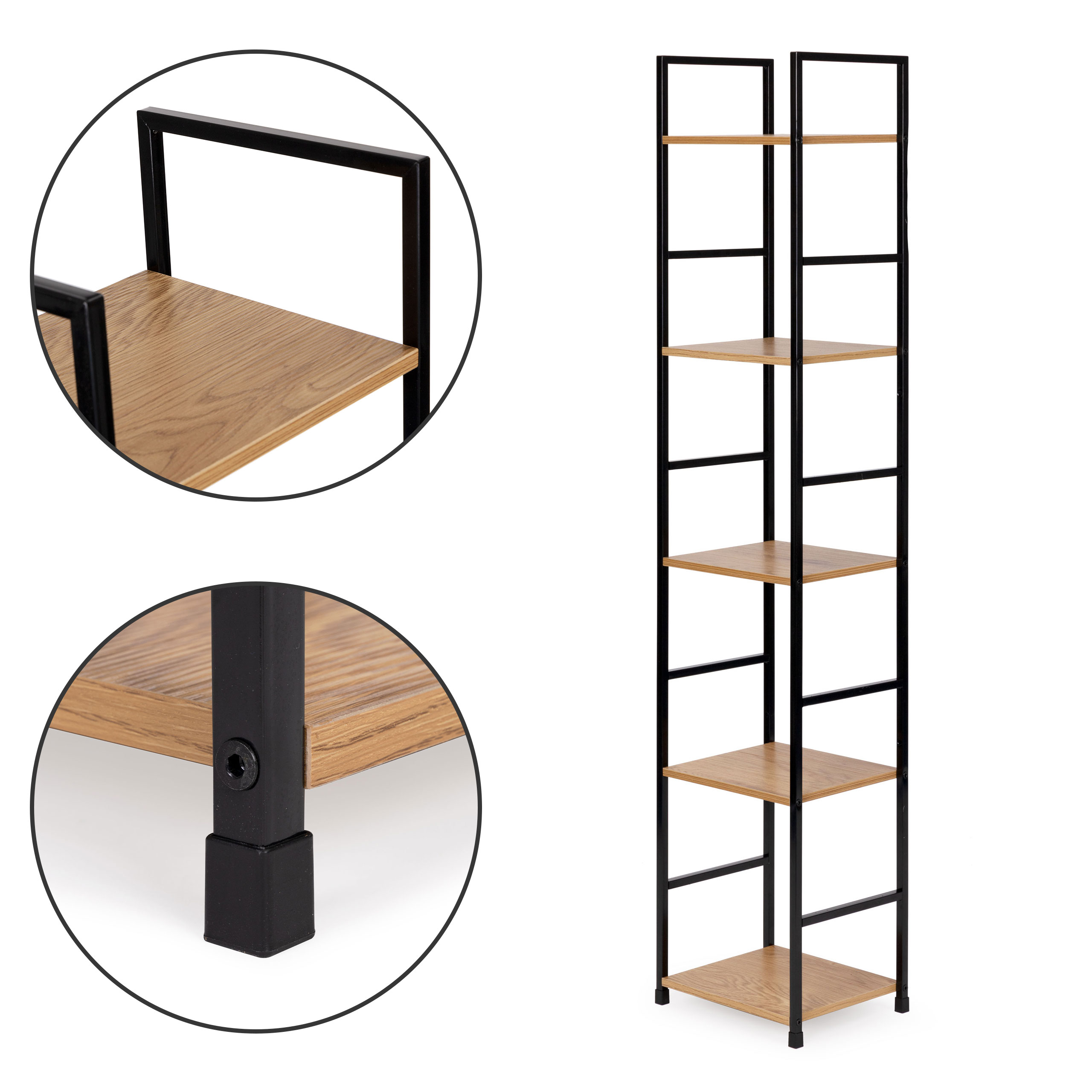 Plaukti ir izgatavoti no MDF plātnes, kas pārklāta ar koksni imitējošu finieri. 23,5 x 29 cm izmēros tajos varēsiet novietot visu, ko vēlaties, lai jums būtu pa rokai. Attālums starp plauktiem ir 31 cm. Plaukta rāmis ir izgatavots no metāla ar pulverkrāsas pārklājumu, tā kājas ir ar speciālām kājiņām, kas aizsargā grīdu no skrāpējumiem. Rāmis ir izgatavots no kvadrātveida profiliem ar 12 mm malu.