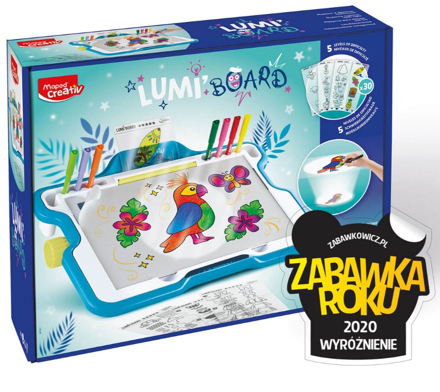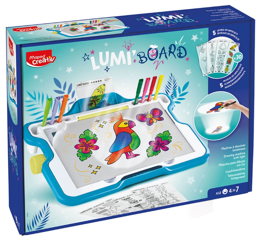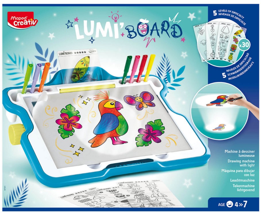 Dāvājiet savam bērnam rīku, kas apvieno mācīšanos ar radošu rotaļu!Maped Lumi izgaismotā tāfele ir unikāls radošs komplekts, kaspavērslieliskas iespējas mazajam māksliniekam apgūt zīmēšanas prasmes. Pateicotiesizgaismotās tāfeles funkcijai, kurā izmantotamoderna LED tehnoloģija, katru zīmējumu var viegli atveidot, vienlaikus vingrinotzīmēšanas tehniku, attīstot roku un sīko motoriku.