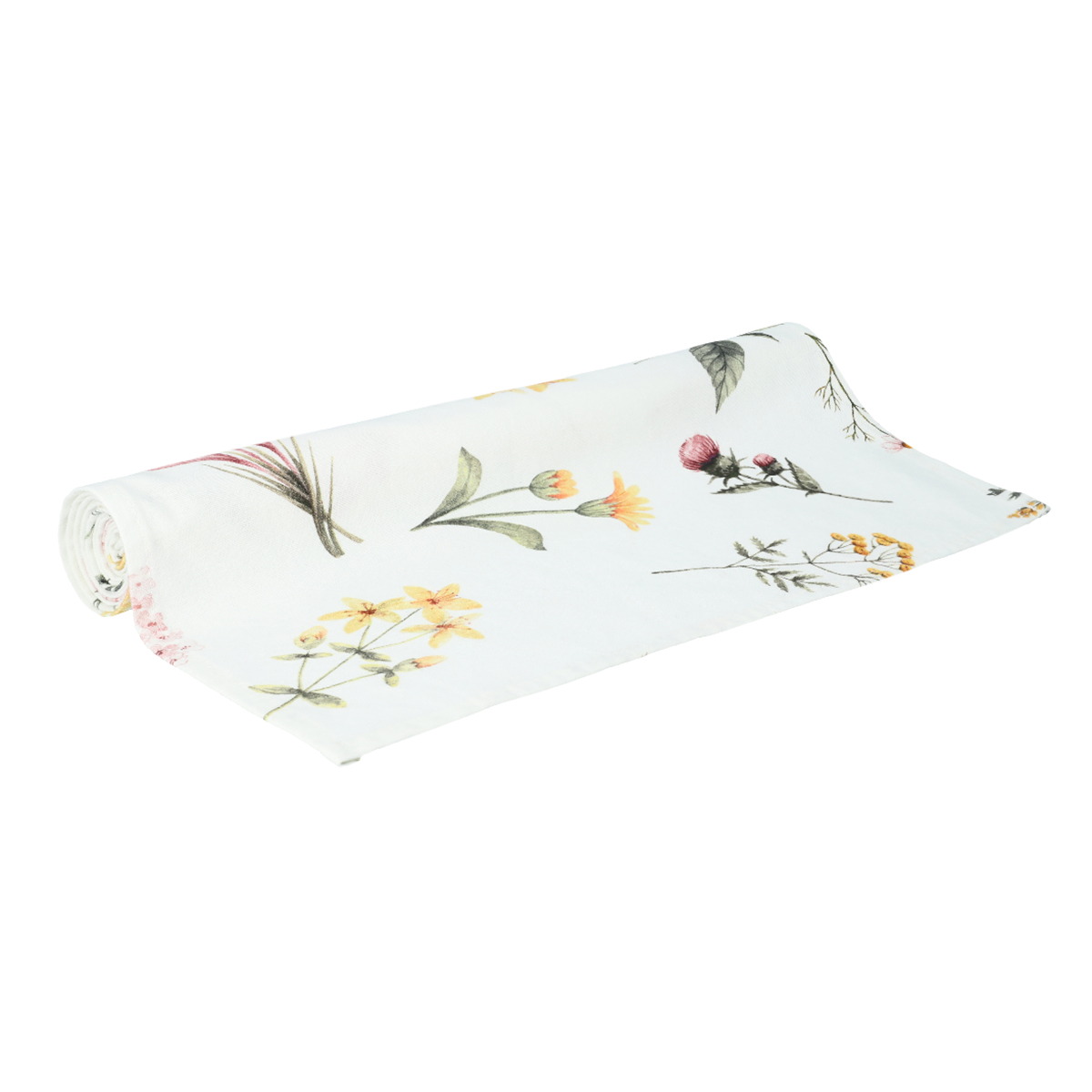 PRIMA teknei ir klasiska iegarena forma. Pamatkrāsa ir pieklusināta, klasiski balta, kas rotāta ar maigu, vieglu ziedu apdruku. Tādējādi parādās vasarīgas zaļas, dzeltenas un maigi rozā krāsas. Tekstila izmēri ir 40×160 cm, tāpēc tas būs piemērots lielākajai daļai pusdienu galdu.