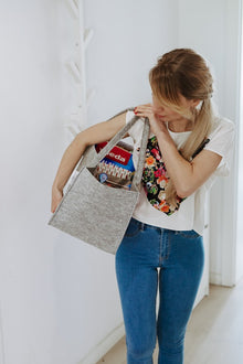Filca maisiņš iepirkumu grozs koka kokogļu zābaku organizators pelēks