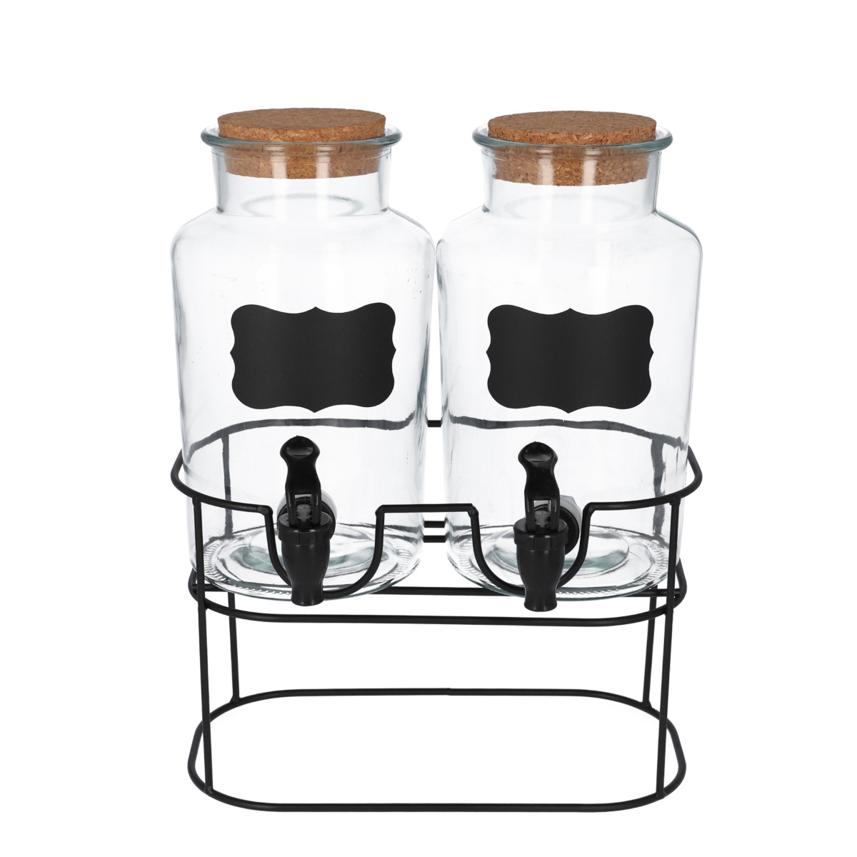 Набор состоит из двух двухлитровых стеклянных банок с краном. Они размещены на металлической подставке, которая идеально сочетается по стилю с диспенсерами. Кроме того, банки закрываются пробкой, которая защищает напиток от попадания внутрь насекомых.