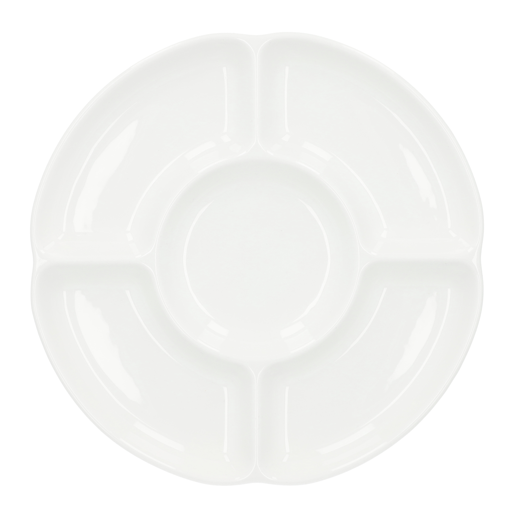 БлюдоFABIO имеет форму круга диаметром 30 см, который разделен на пять секций, что позволяет подавать небольшие порции пяти различных деликатесов. Оно изготовлено из белого фарфора.
