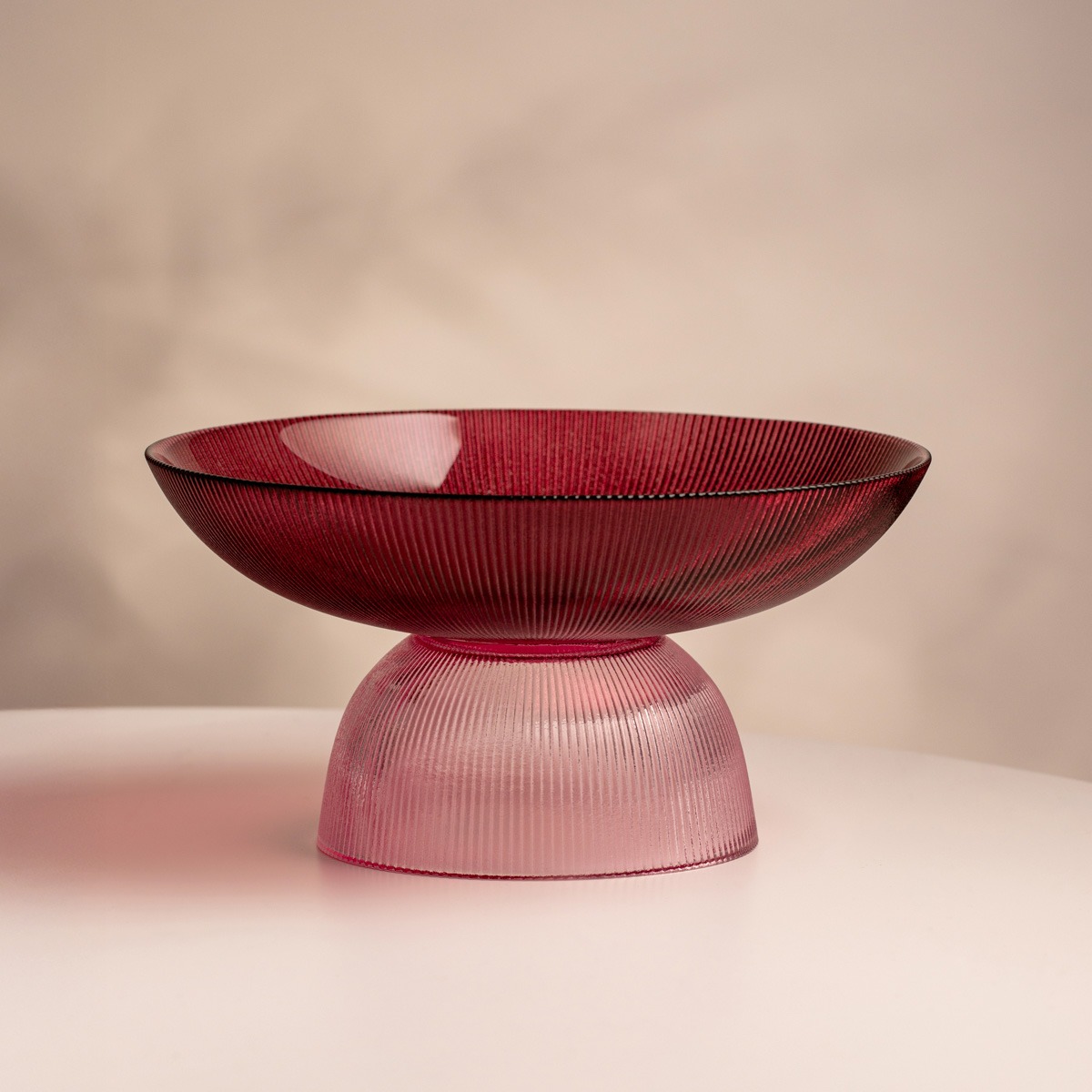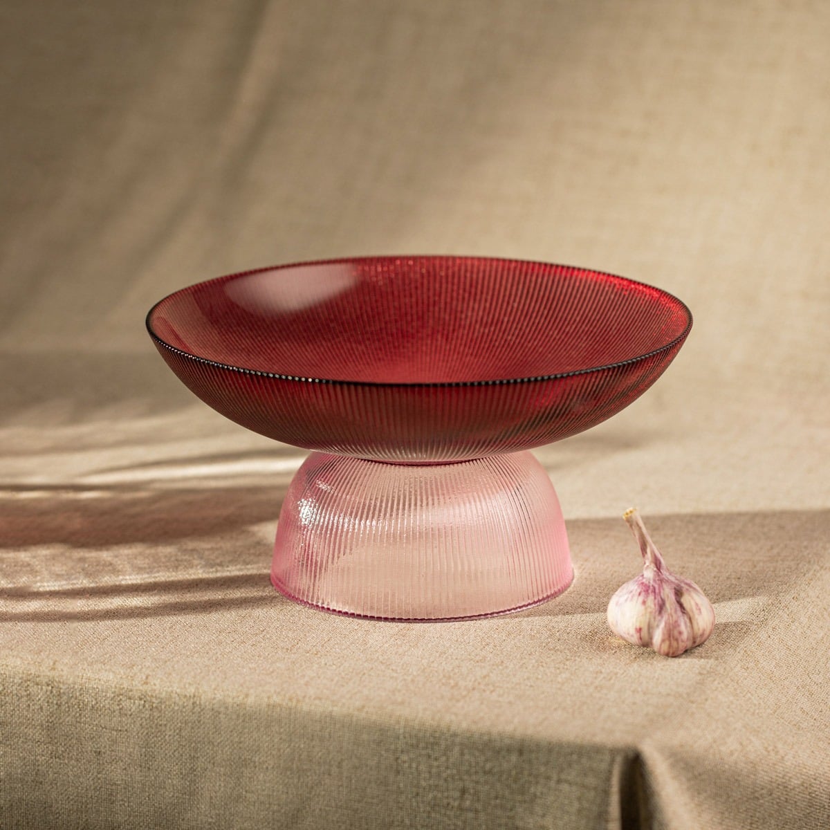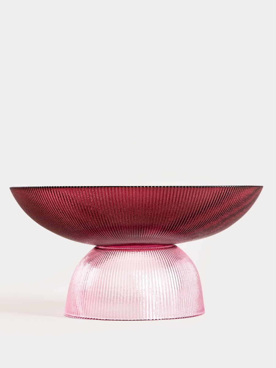 Блюдо MEGALO — это утилитарный предмет и в то же время прекрасный образец художественного дизайна. Поставленное на кухне, в столовой или на элегантно сервированном столе во время праздничного обеда или ужина, оно станет одним из самых заметных элементов дизайна. Рифленое декоративное стекло впечатляет своим градиентным цветом, гармонично переходящим от нежно-розового до глубокого бордового.