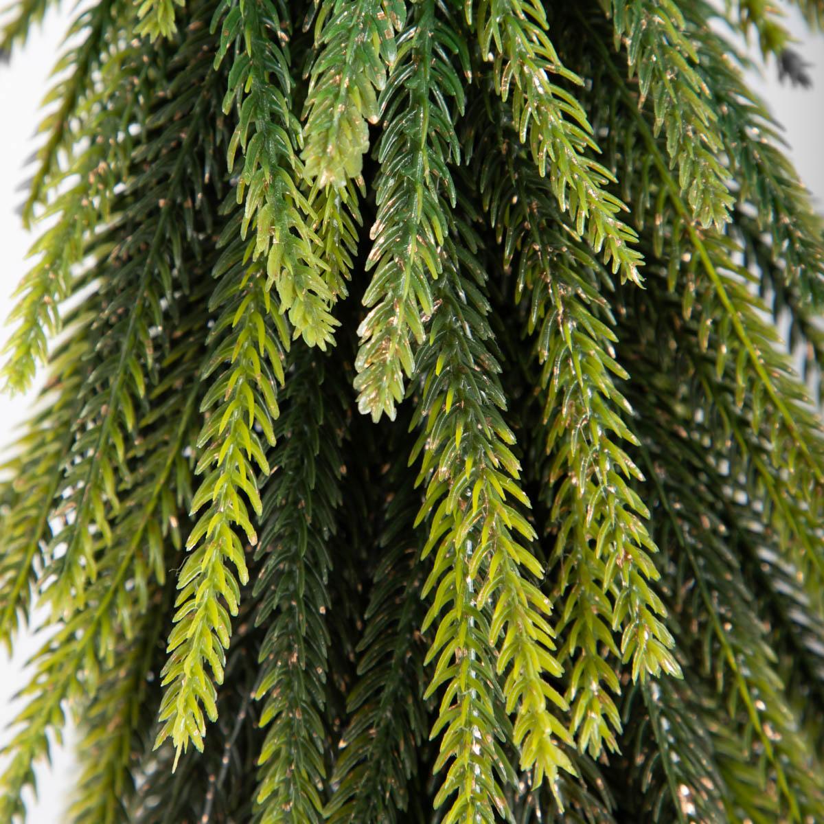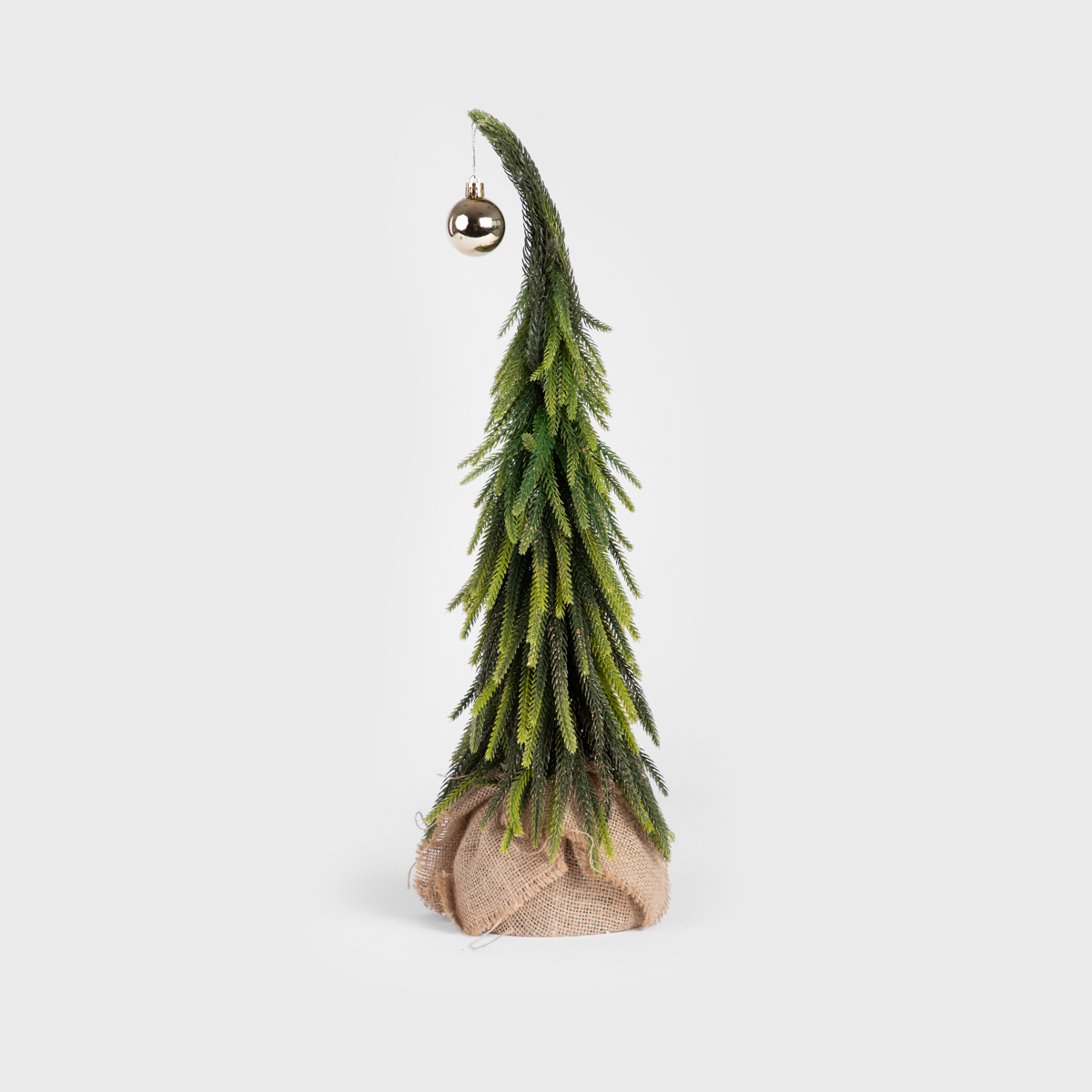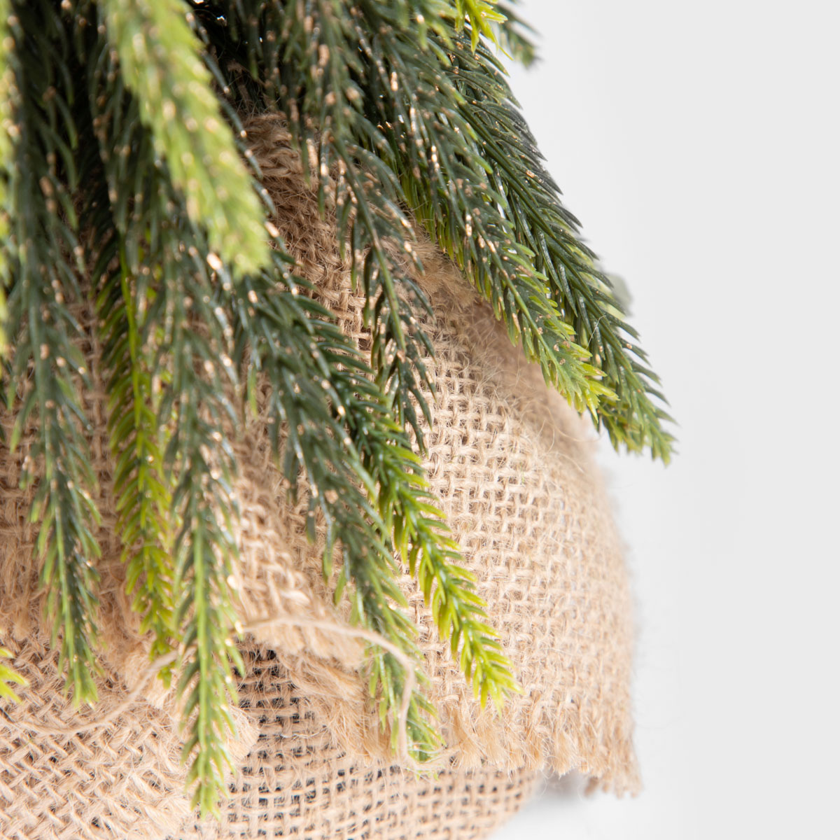Елка изготовлена из высококачественного пластика, который идеально имитирует натуральные ветви. Основание покрыто стильно свернутой джутовой тканью, перевязанной бечевкой.