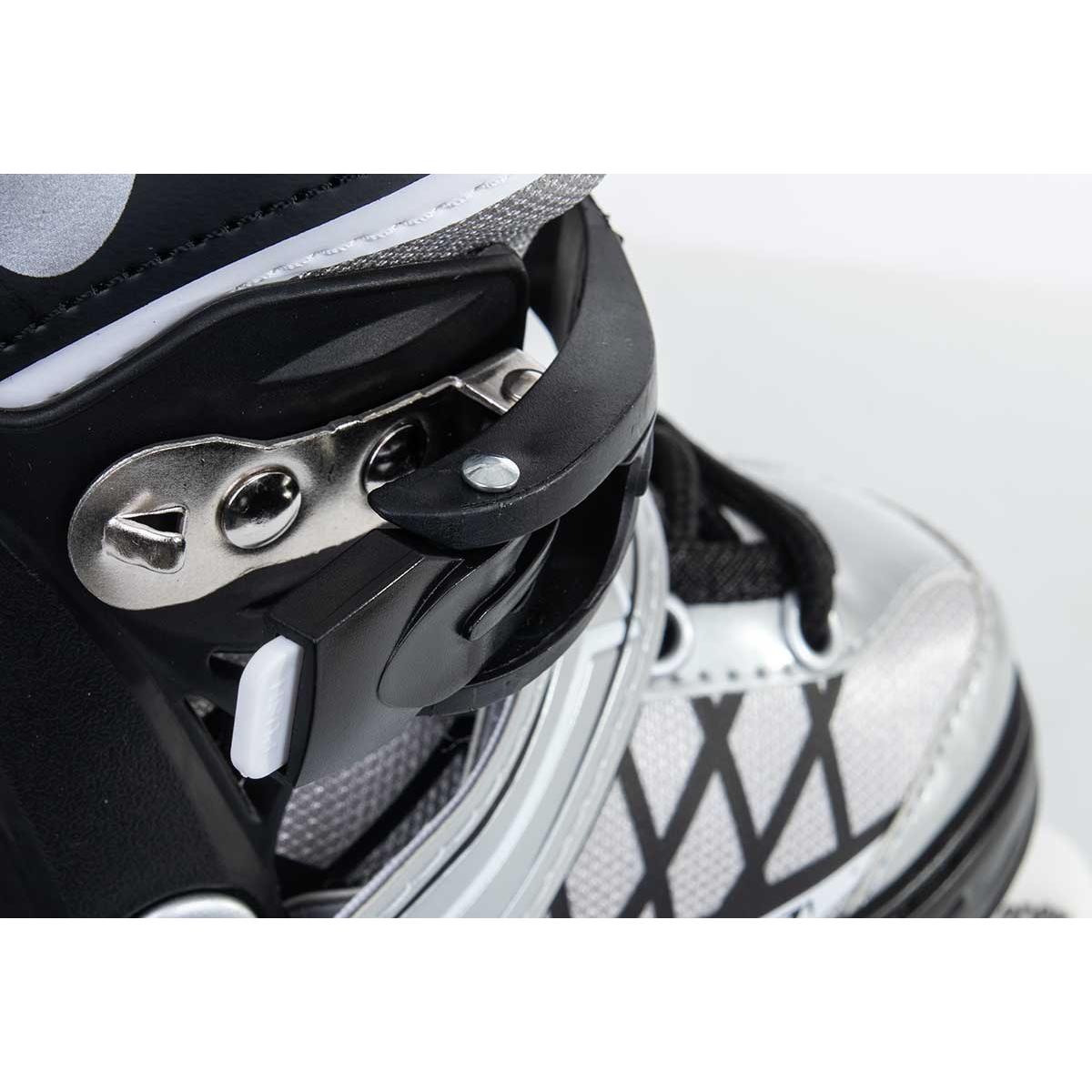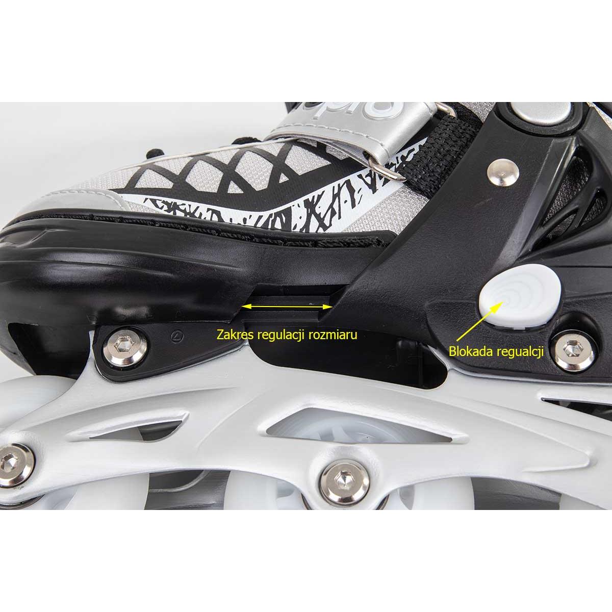 Они оснащены легким и прочным алюминиевым полозом, тормозом, молочными колесами диаметром 70 мм с белымисветодиодными лампами, тремя регулируемыми креплениями и регулировкой размера. Колеса и подшипники класса ABEC7 обеспечивают меньшее сопротивление качению и могут использоваться для катания на длинные дистанции и прогулочного катания. Усиленный верх ботинка, защищенный водонепроницаемым слоем, широкий удобный крой и мягкая подкладка вокруг лодыжки значительно повышают комфорт при катании. Стельки выполнены из прочного металла, устойчивого к повреждениям и ржавчине.