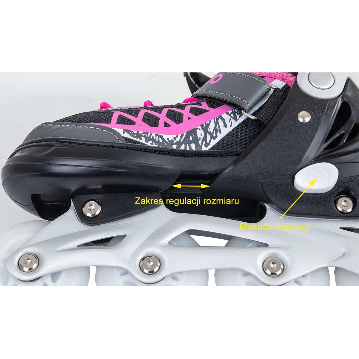 Они оснащены легким и прочным алюминиевым полозом, тормозом, молочными колесами диаметром 70 мм с белымисветодиодными лампами, тремя регулируемыми креплениями и плавной регулировкой размера. Колеса и подшипники класса ABEC7 обеспечивают меньшее сопротивление качению и могут использоваться для катания на длинные дистанции и прогулочного катания. Усиленный верх ботинка, защищенный водонепроницаемым слоем, широкий удобный крой и мягкая подкладка вокруг лодыжки значительно повышают комфорт при катании. Полозья коньков изготовлены из прочного металла, устойчивого к повреждениям и ржавчине.