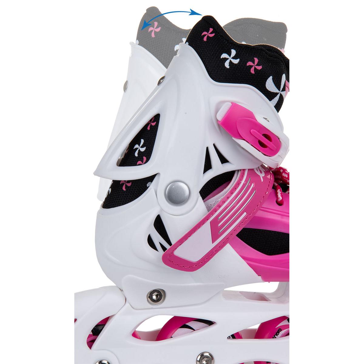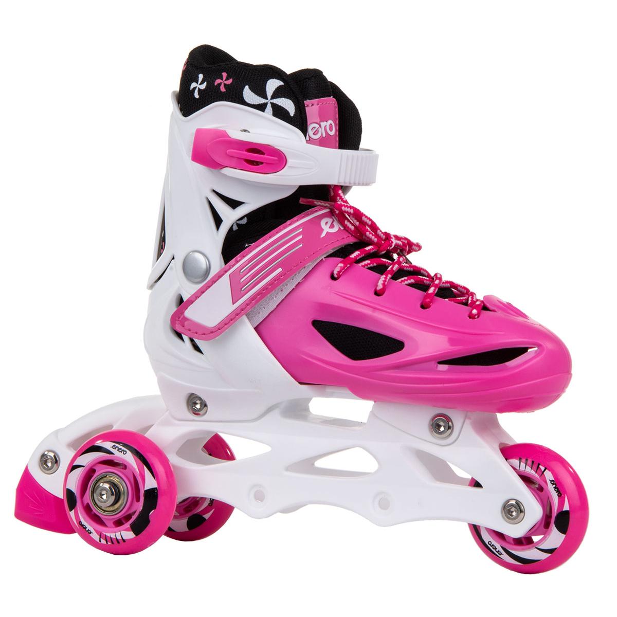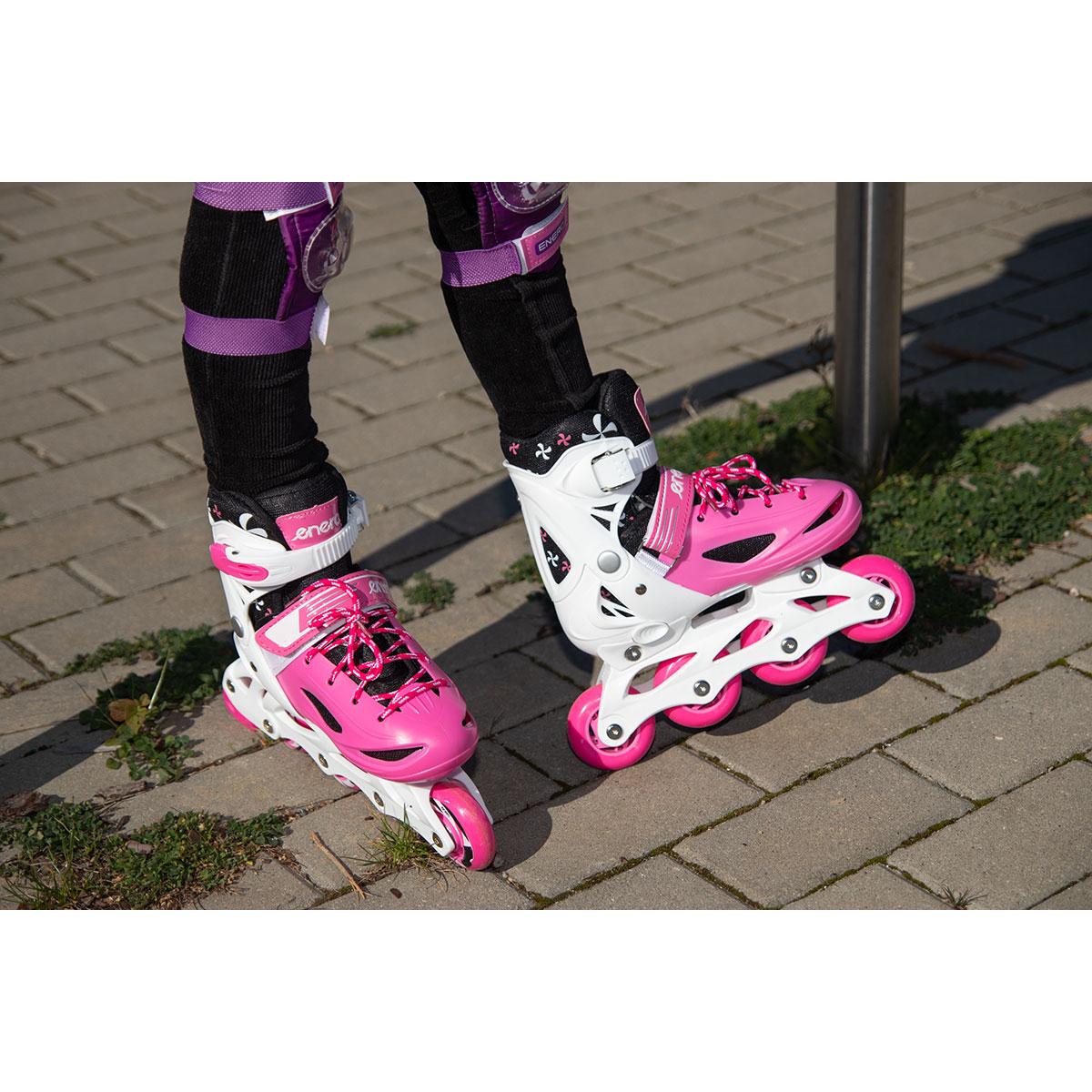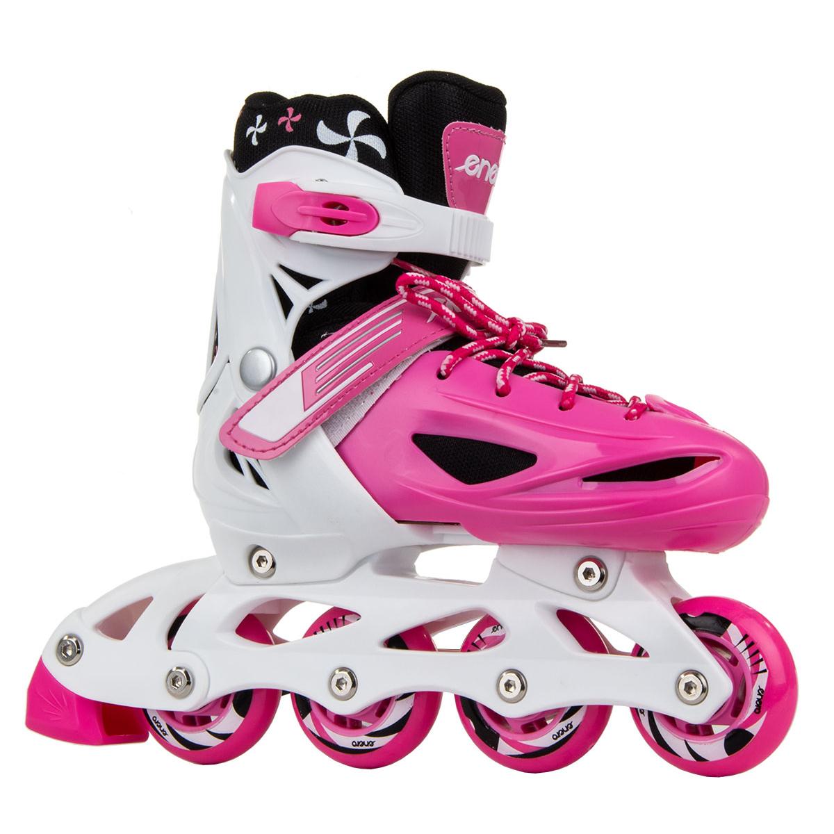 Коньки — 3 SKATE — Коньки — Коньки — Коньки — Коньки — Коньки 4W1 ENERO гарантируют чистое удовольствие от катания. Они оснащены легким и прочным полозом из полипропиленового материала, тормозом на одном коньке, колесами из ПВХ диаметром 64 мм и шириной 22 мм, регулируемыми 3 креплениями и регулировкой размера. Колеса из ПВХ и подшипники ABEC 5 обеспечивают меньшее сопротивление качению, хорошо адаптируются к грунту и идеально подходят для обучения или спокойного развлекательного катания. Усиленный верх ботинка , широкий удобный крой и мягкая подкладка вокруг лодыжки значительно повышают комфорт коньков. Лезвие коньков, изготовленное из нержавеющей стали, устойчиво к повреждениям и ржавчине.