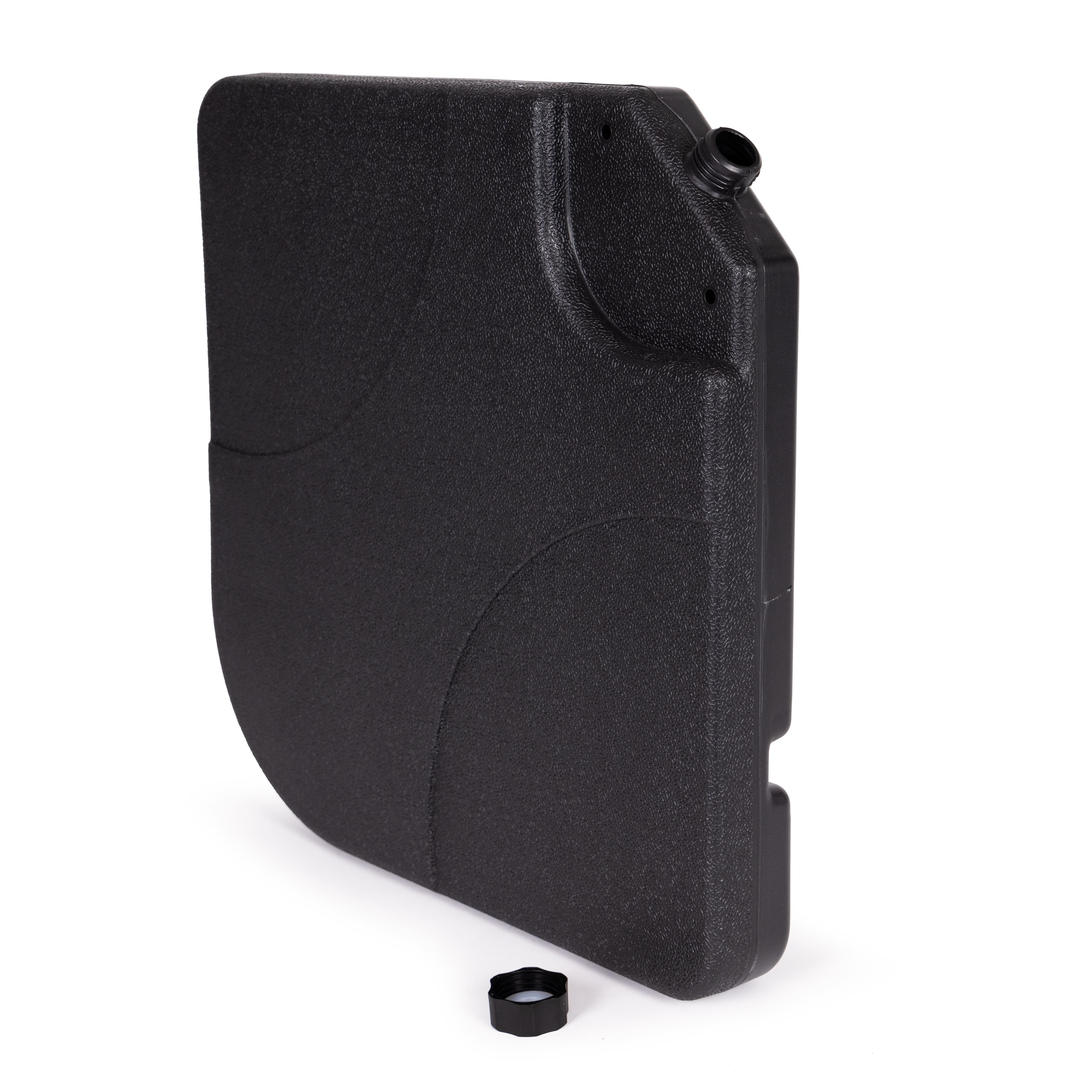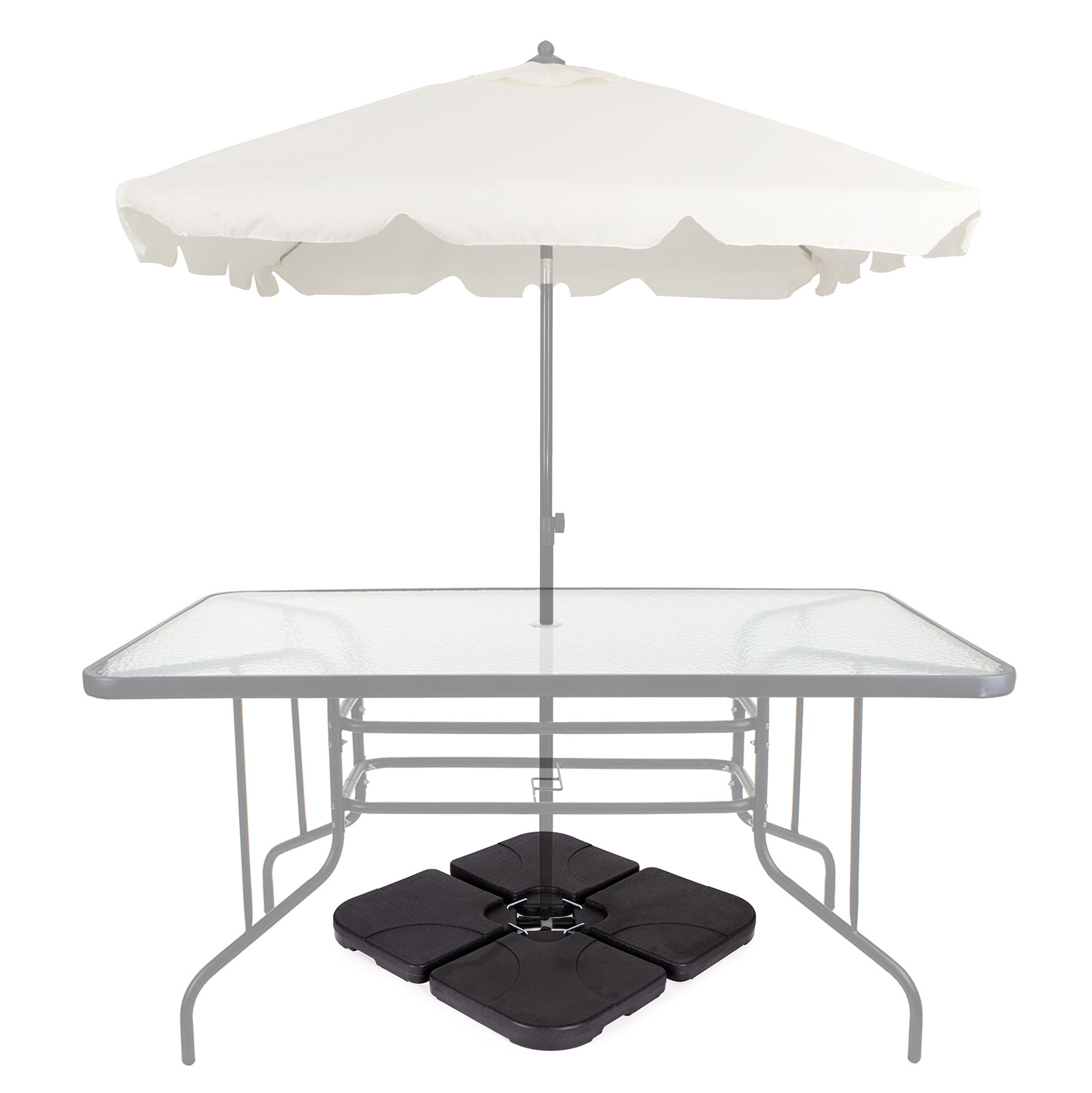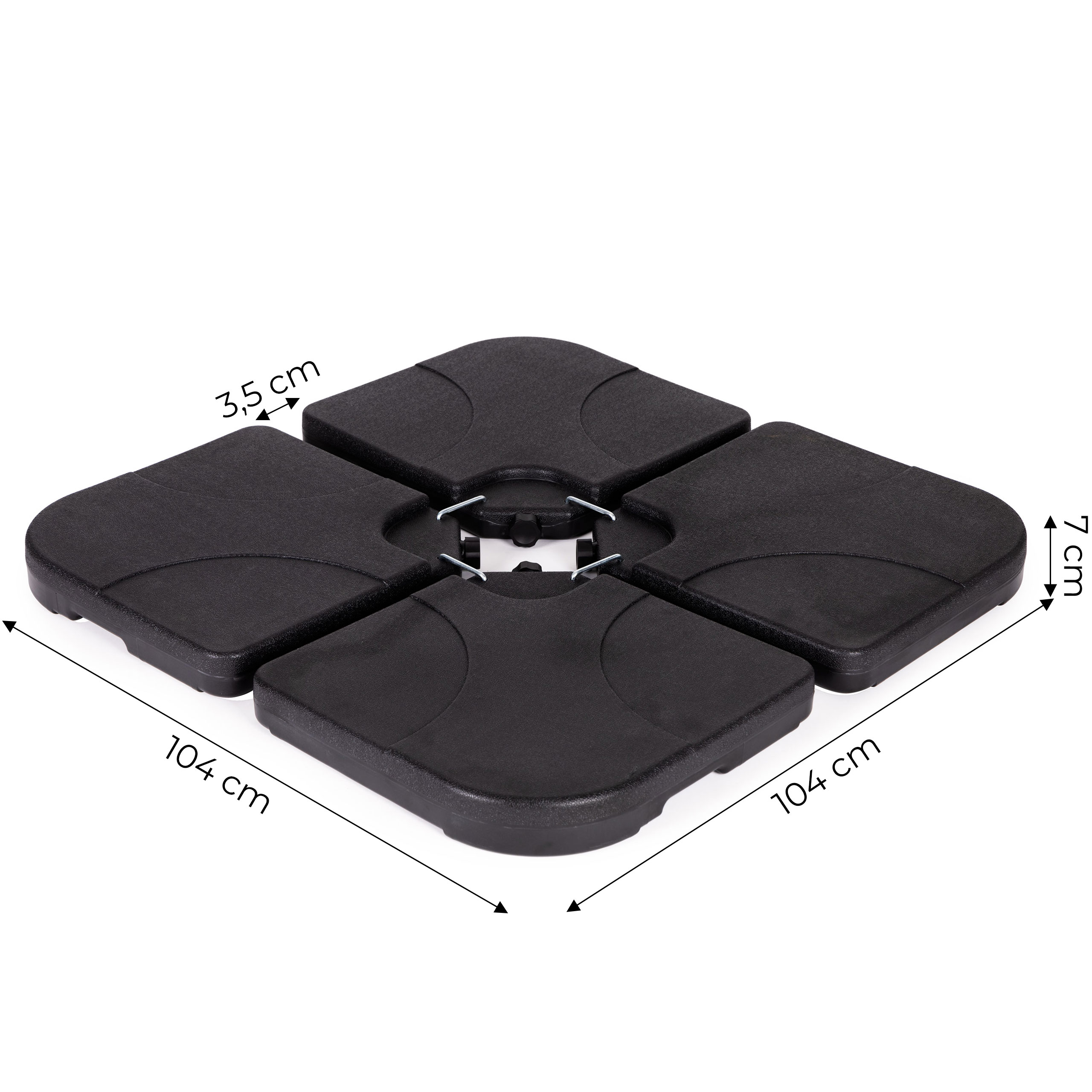 Каждая из 4 панелей основания имеет завинчивающуюся крышку, которую можно снять, чтобы наполнить основание водой. Каждая панель вмещает до 15 литров, а общий вес после наполнения достигает примерно 60 кг, обеспечивая устойчивость даже больших зонтов.