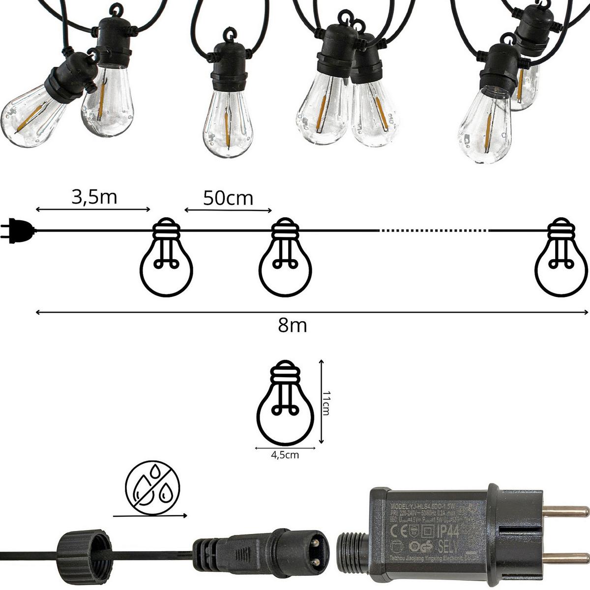 Общая длина гирлянды — 8 метров, расстояние между лампочками — 50 см, что делает ее идеальным вариантом для различных композиций: вы можете развесить ее вдоль террасы, обернуть вокруг беседки, прикрепить к перголе или растянуть между деревьями. Равномерное расстояние между лампочками обеспечивает равномерное освещение, придавая вашему пространству гармоничный и элегантный вид.