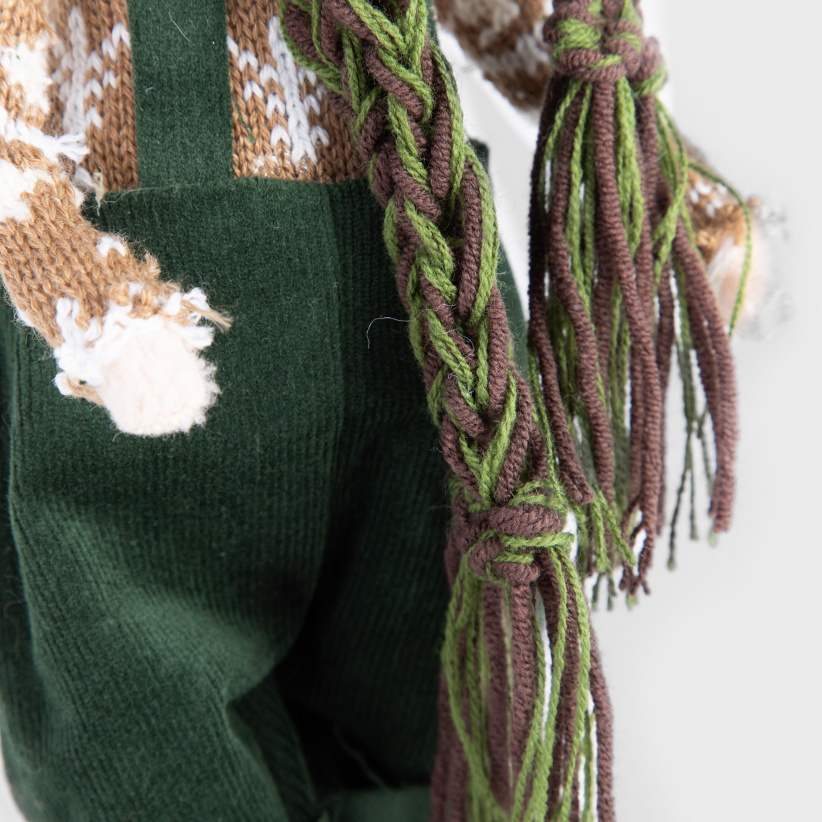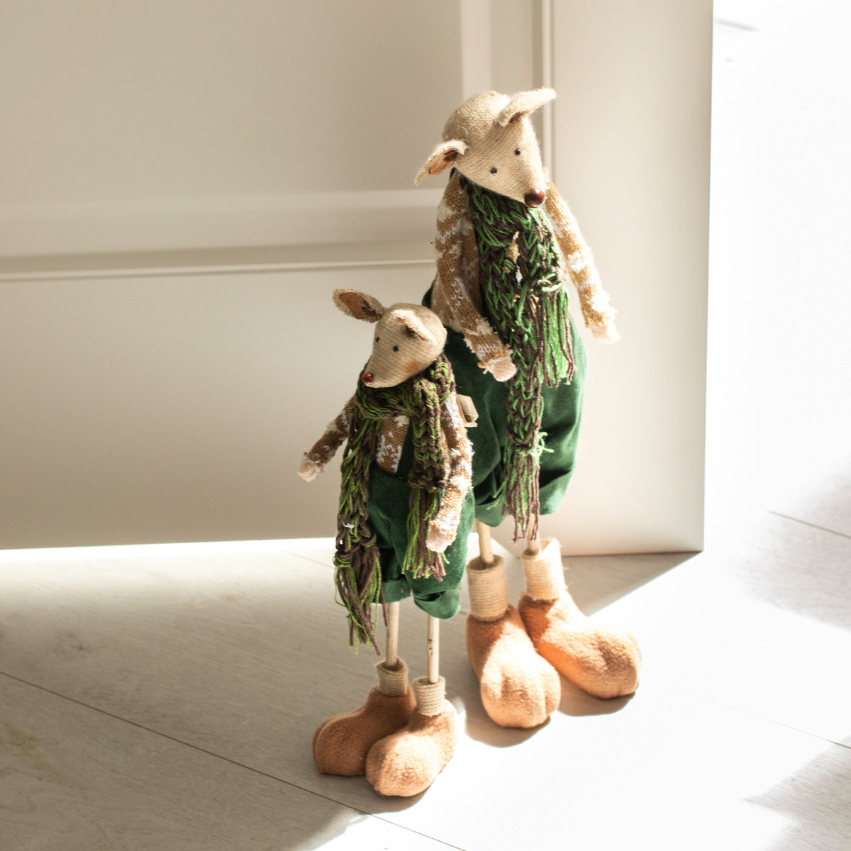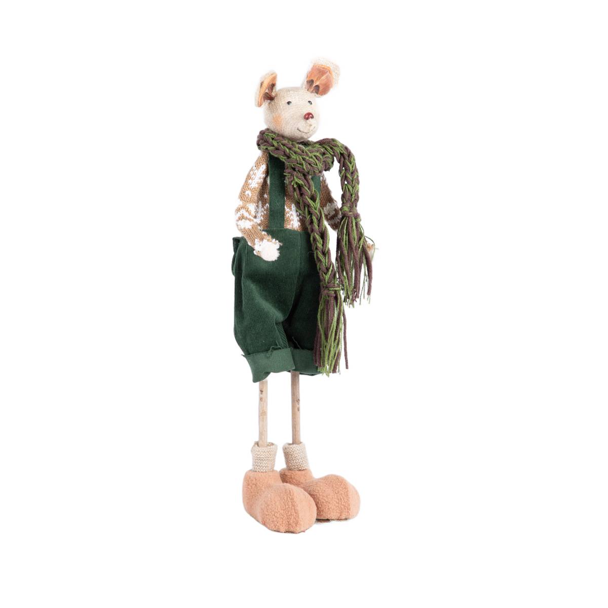 Рождественская фигурка изображает фигурку мышки, одетую в зимний стиль, который сразу же привлекает внимание своей милой эстетикой. Мышка одета в зеленые шорты с лямками, бежевый джемпер с зимним узором и длинный зелено-коричневый шарф, который придает ей теплый, деревенский вид. Большие мягкие ботинки и аккуратно закрученные ушки дополняют милый образ фигурки.
