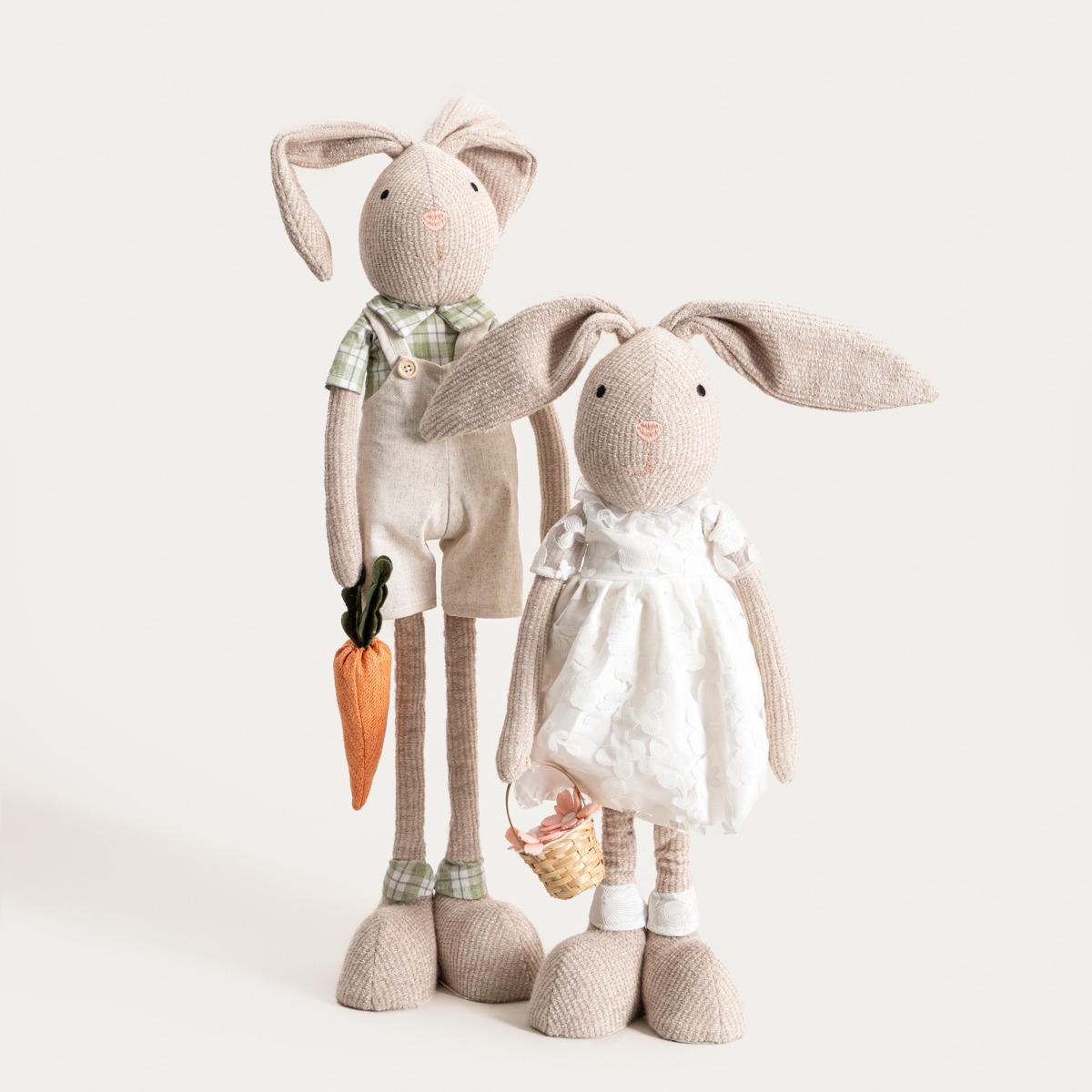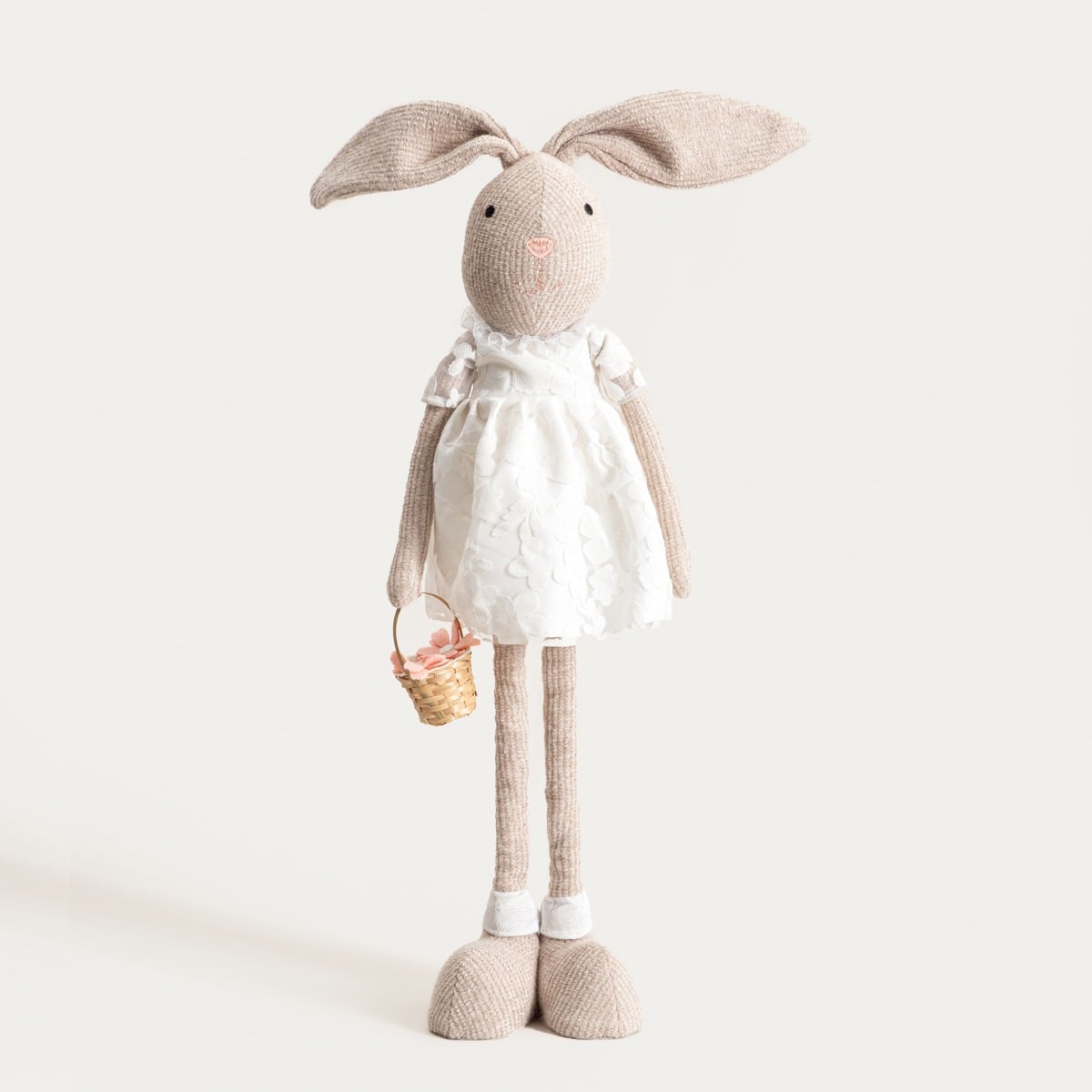 Гном MATTIA изображает стоящего зайца с вытянутым, стройным силуэтом, сидящего на телескопических ножках. Регулируемая конструкция позволяет легко изменять высоту украшения в зависимости от площади экспозиции. Заяц одет в платье светлого цвета, что придает всему украшению элегантный и гармоничный вид. Длинные уши, пропорционально подобранные элементы костюма и пасхальная корзинка подчеркивают декоративный характер фигурки, сохраняя при этом легкость и утонченность формы.