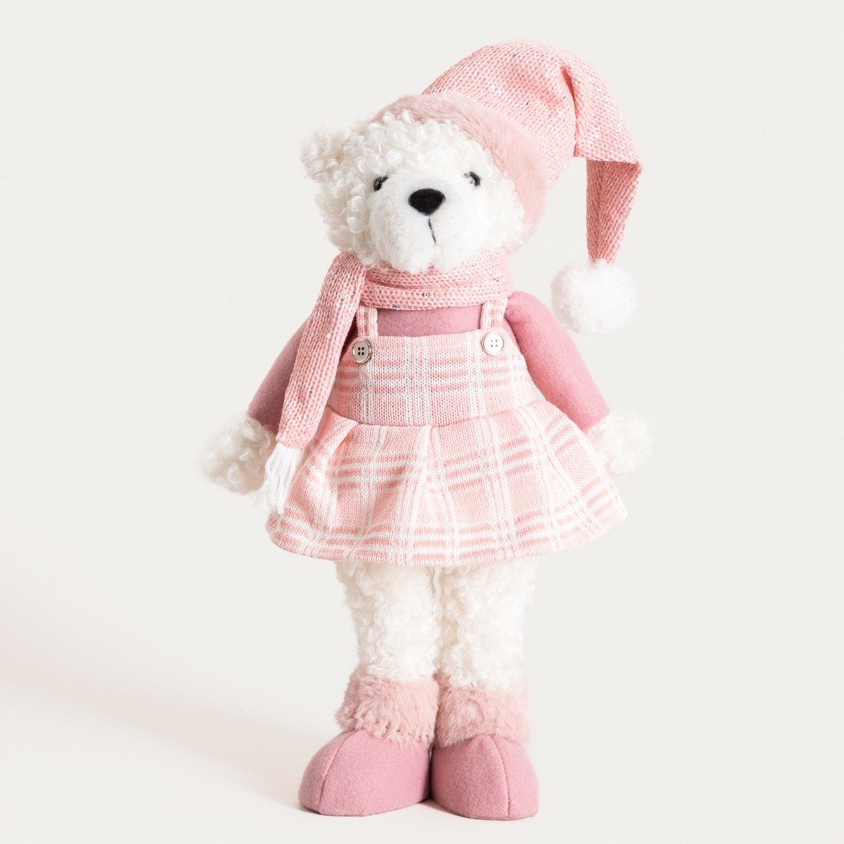 Этот очаровательный рождественский гном в розовой одежде порадует вас своим пушистым мехом и тщательно проработанными деталями. Симпатичное платье с лямками, мягкий шарф, очаровательная шапочка и пинетки создают неповторимый стиль, благодаря чему миссис Тедди идеально дополнит любой зимний интерьер. Украсьте свой дом к праздникам уникальным гномом!