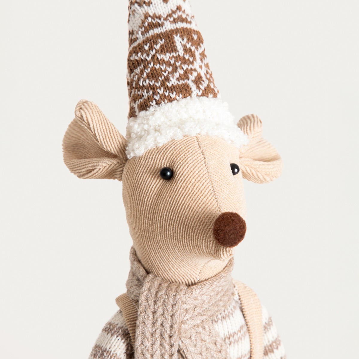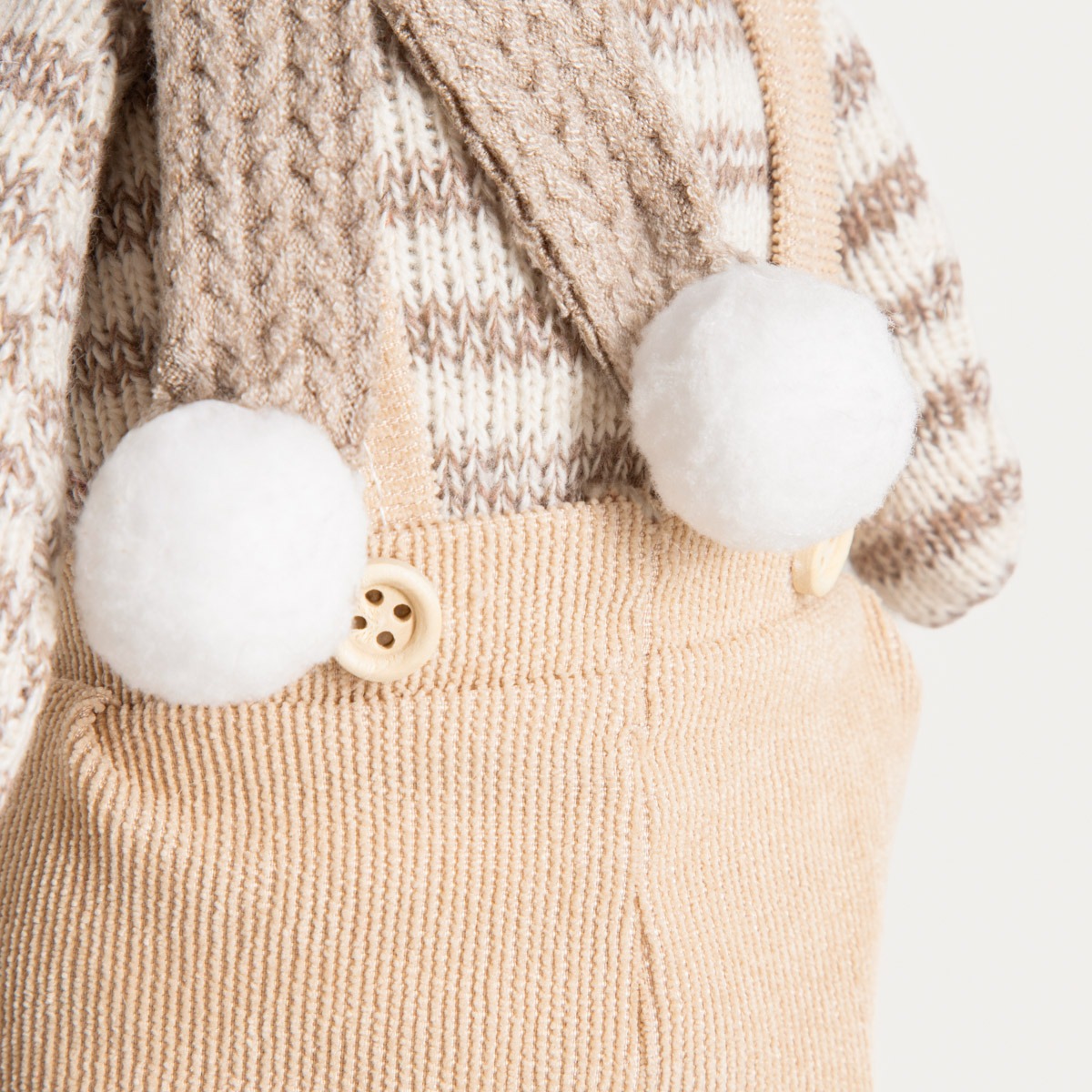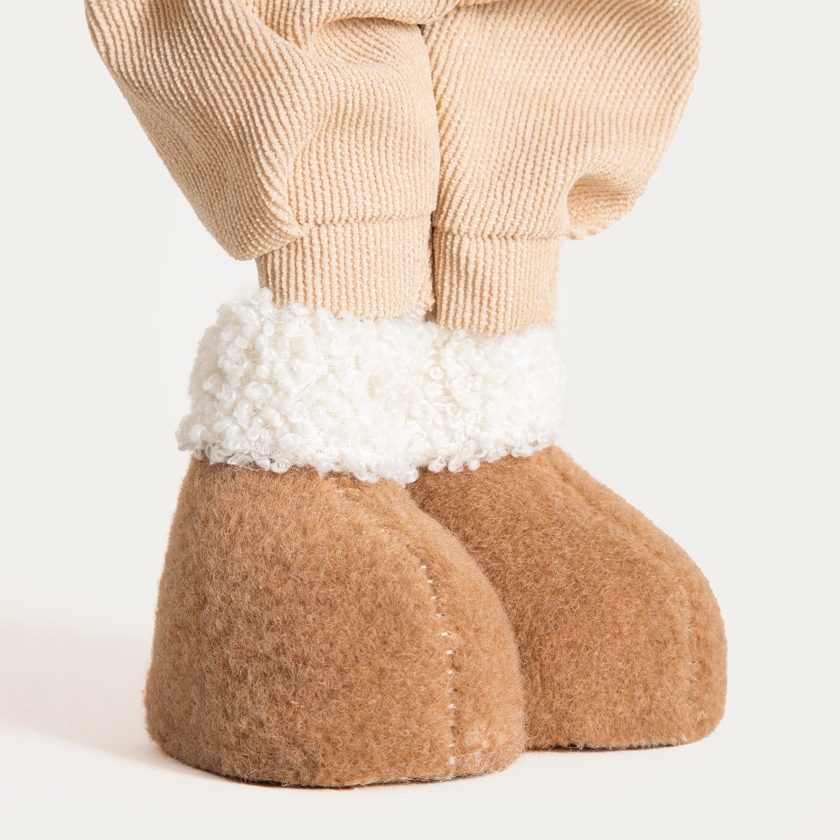 Гном одет в джемпер, шорты, шапку и шарф бежевого цвета. Некоторые элементы наряда украшены декоративными помпонами и овчиной. Мордочка, одежда и обувь гнома имеют мягкую, но разнообразную фактуру. Весь декор выдержан в бежевом цвете. Благодаря милой форме и мягким материалам гном выглядит особенно уютно.