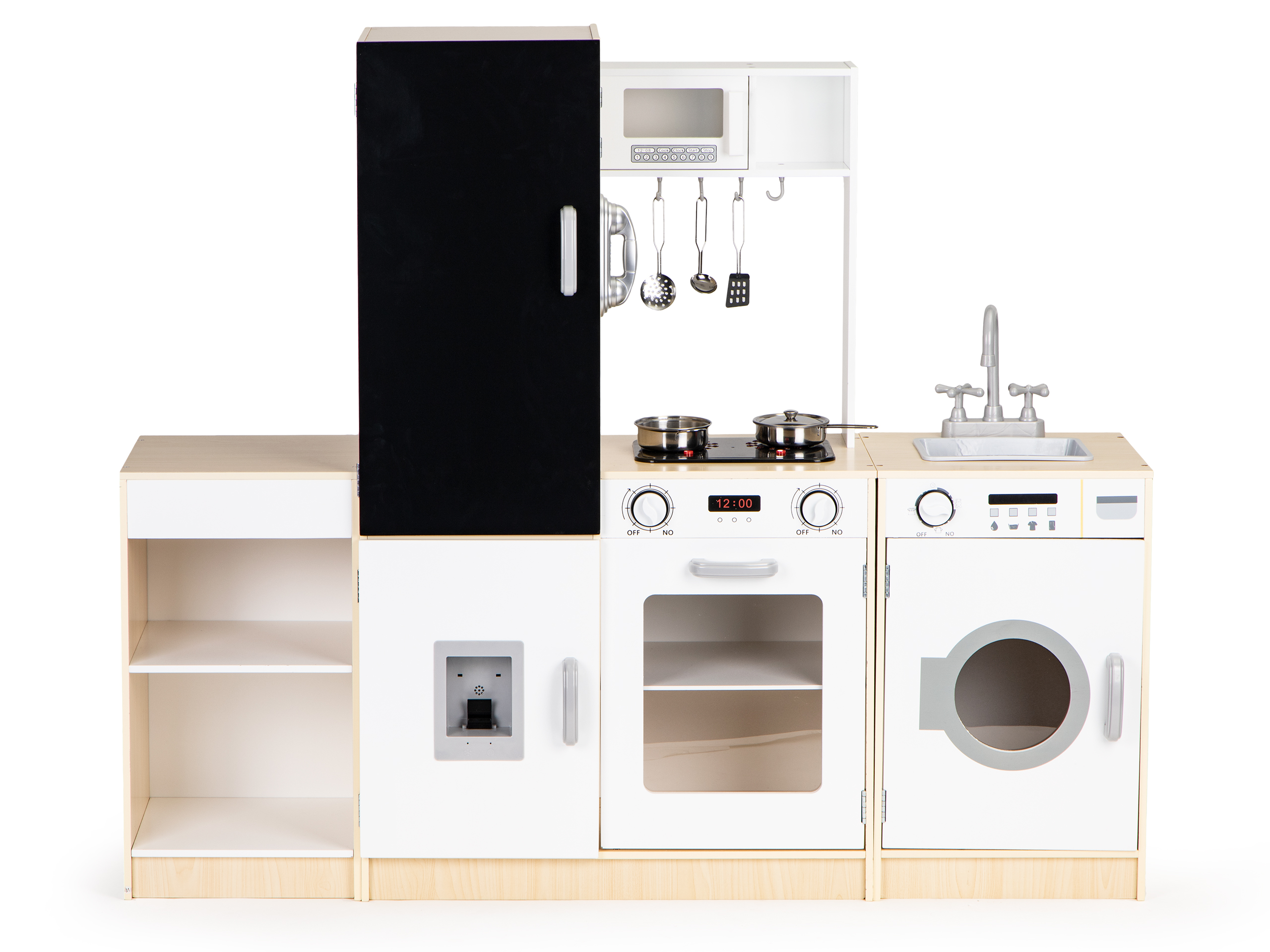 Большой открывающийся холодильник пригодится для хранения продуктов, необходимых для приготовления самых вкусных блюд. Дверца холодильника покрыта специальной краской, поэтому ее можно использовать как меловую доску. На боковой стенке расположен игрушечный телефон.