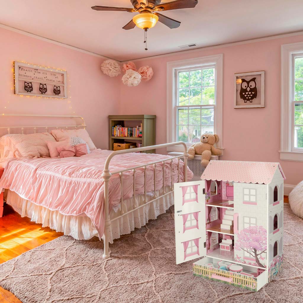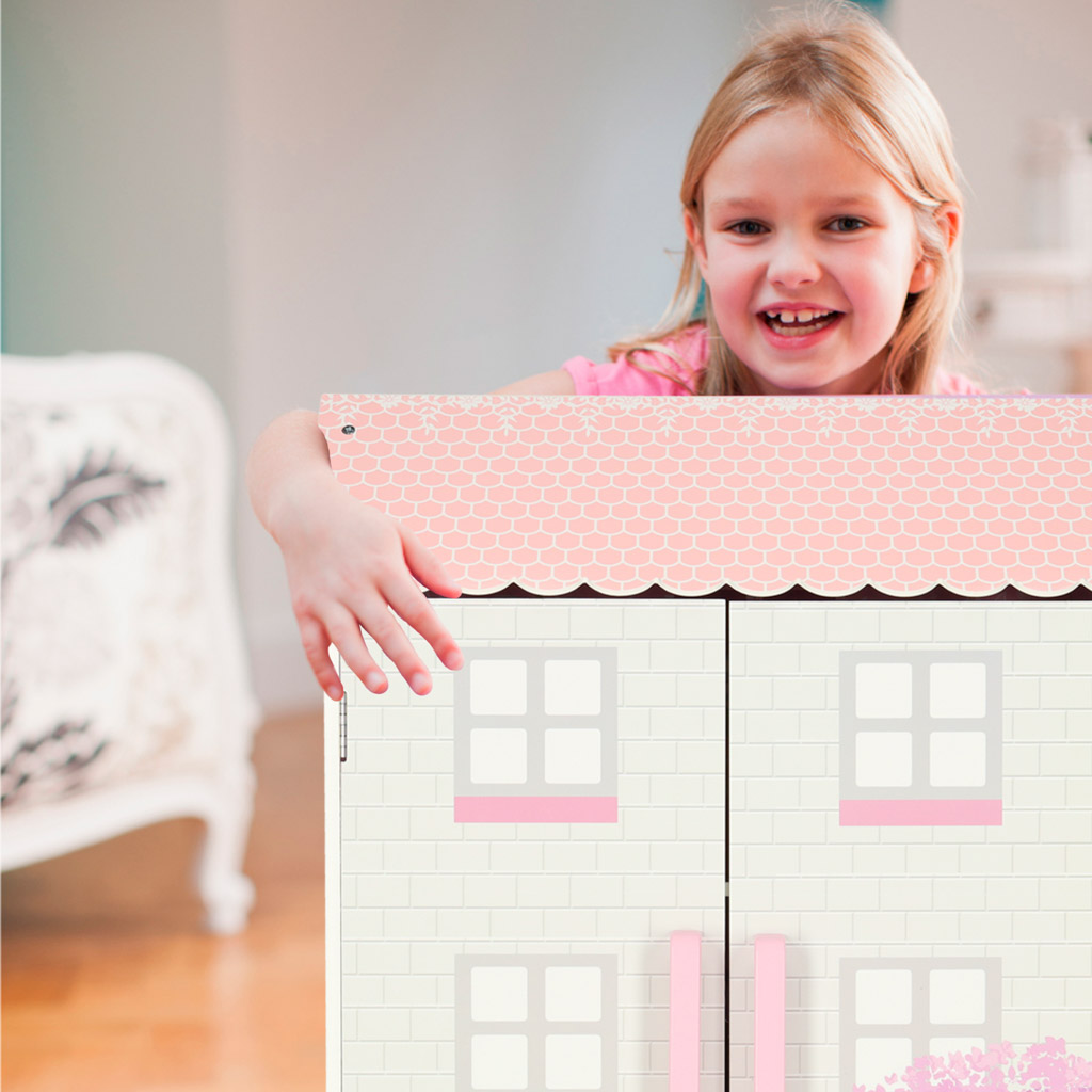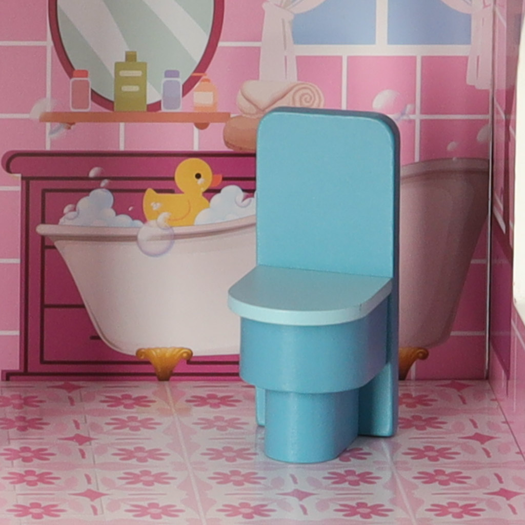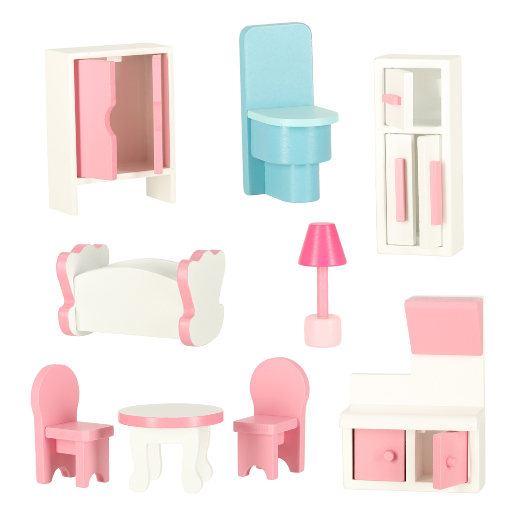 Дом обставлен 9 миниатюрными предметами мебели пастельных тонов. Мебель можно расставить по своему усмотрению, а также сразу же завести в дом плюшевых мишек, кукол или маленькие фигурки. Игровой домик или фотосессия в кукольном домике помогут детям развить творческие способности и воображение.