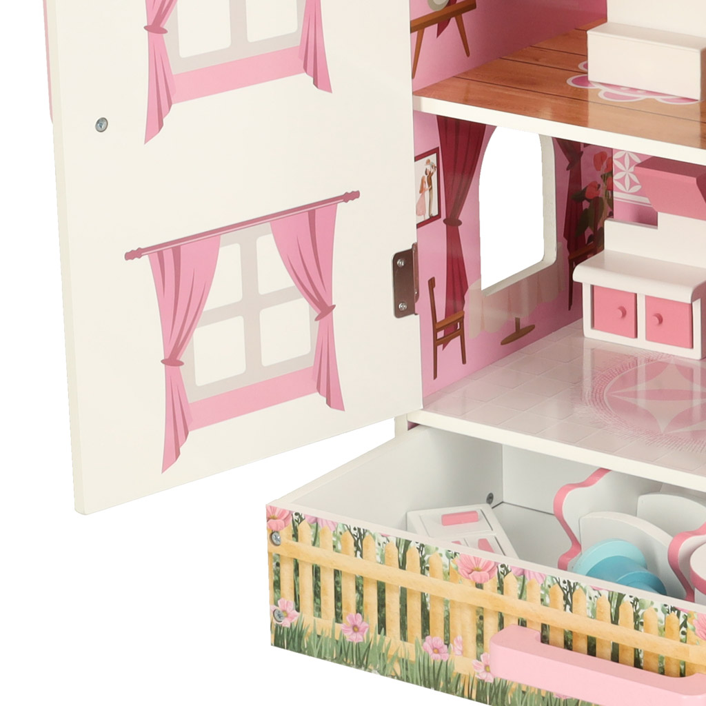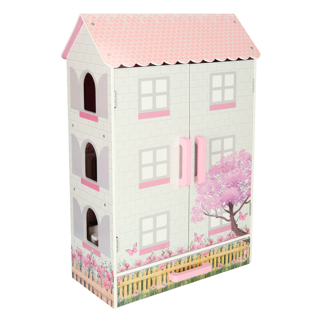 Открывающийся кукольный домик в очаровательном стиле станет не только местом для творческой игры, но и украшением детской комнаты. В доме три этажа с кухней, ванной, спальней, гостиной и лестницей. Дверцы и ящики, закрывающиеся на магниты, позволяют легко поддерживать порядок в комнате — просто уберите игрушки внутрь после игры.