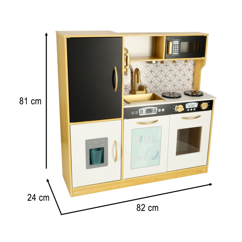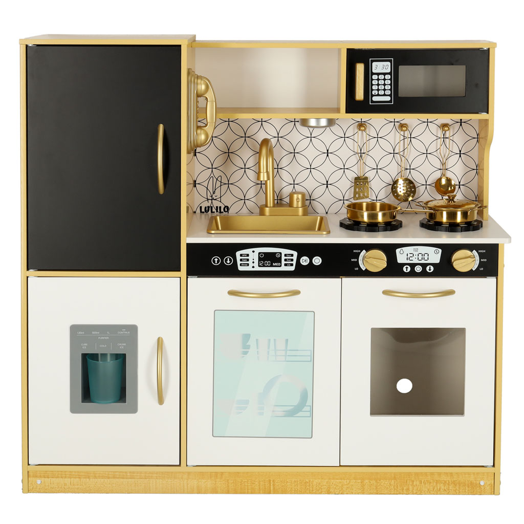 Деревянная кухня от LULILO это замечательная развивающая игрушка, которая приглашает детей в мир кулинарных экспериментов и позволяет им развивать свои творческие способности и ручные навыки. Благодаря продуманному дизайну и элегантному внешнему виду кухня привлекает внимание и вдохновляет на творческую игру. Изготовленная из прочного дерева, она сочетает в себе классический стиль и современные детали, а ее черно-белая цветовая гамма с золотыми акцентами станет дополнением к детской комнате.